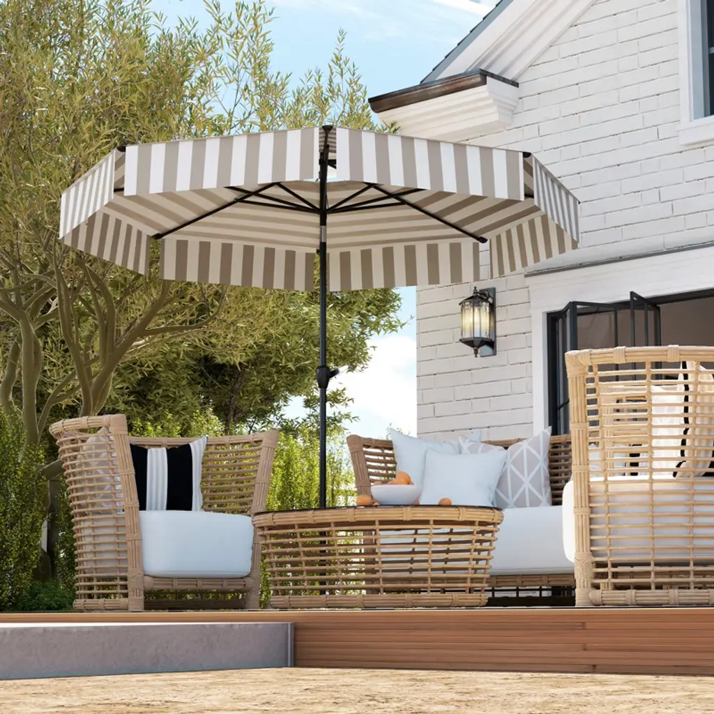 Like to read in the great outdoors? Enjoy picnics out in the summer breeze? Have a table for an umbrella but no umbrella? Say goodbye to sunburns this summer with Outsunny market umbrella. This balcony umbrella offers you UPF 30+ protection, blocking most harmful rays, making it a great choice for your outdoor activities. It's an outdoor-ready umbrella with fade and splash resistant polyester fabric and eight metal ribs. This large patio umbrella provides soothing shade throughout the summer.