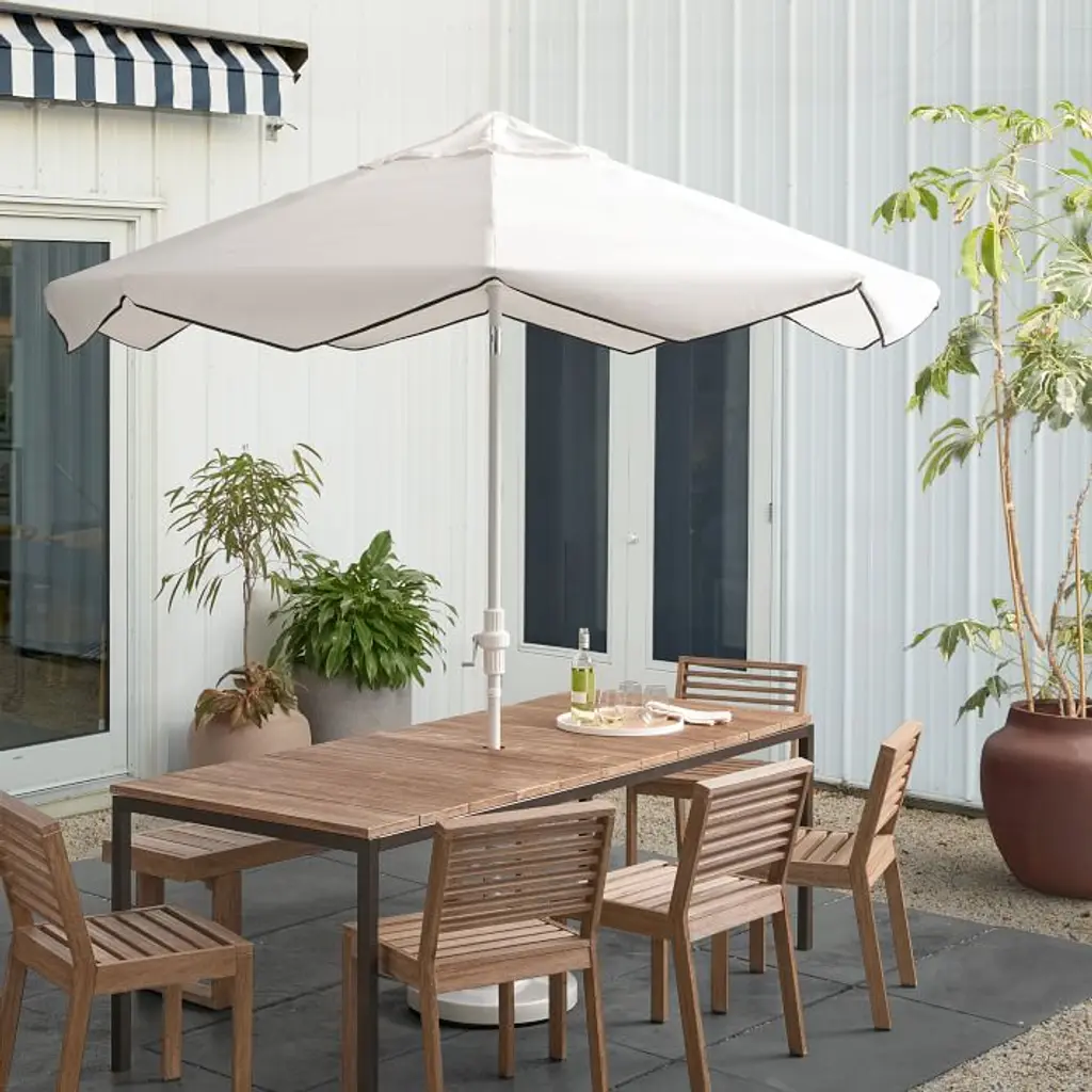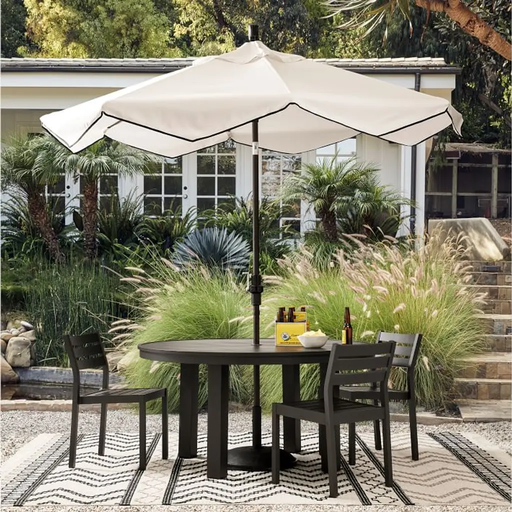 We have you covered with our Round Outdoor Patio Umbrella. Assembled in the USA, the durable canvas fabric is weather- and UV-resistant to keep you cool during hot summer days. 108"diam. x 102"h. Aluminum pole. 100% acrylic Sunbrella® fabric shade. Natural Canvas canopy color has a Black trim; All other colors have a White trim. Weather- and UV-resistant. Opens via crank mechanism. Provides 63 square feet of shade (perfect for a 6 person dining set). Recommended for use with West Elm's Round Umbrella Base (sold separately). Outdoor Umbrella Cover available (sold separately). Assembled in the USA.