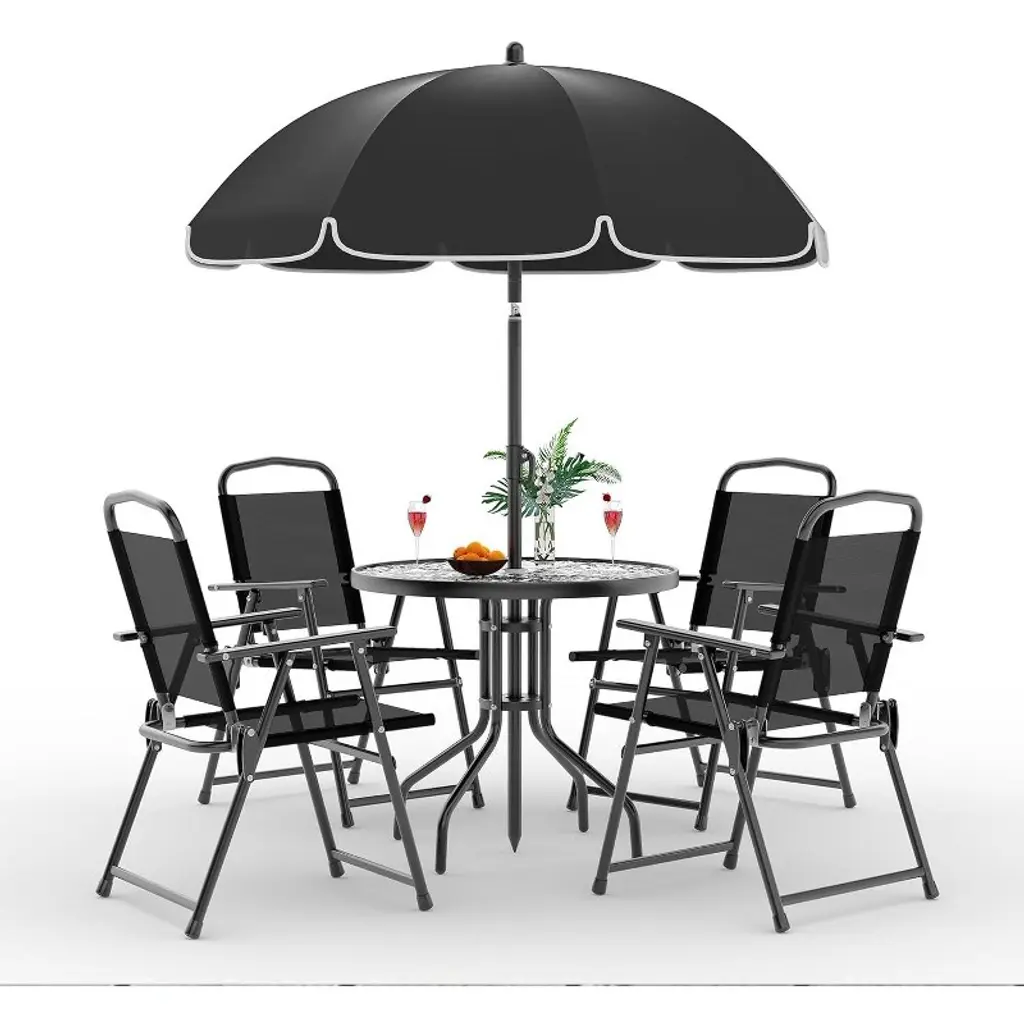 Patio Dining Set For 4 With Umbrella, Outdoor Furniture Set With 4 Folding Dining Chairs, Table Umbrella With Tempered Glass Top Dinings Table, Black