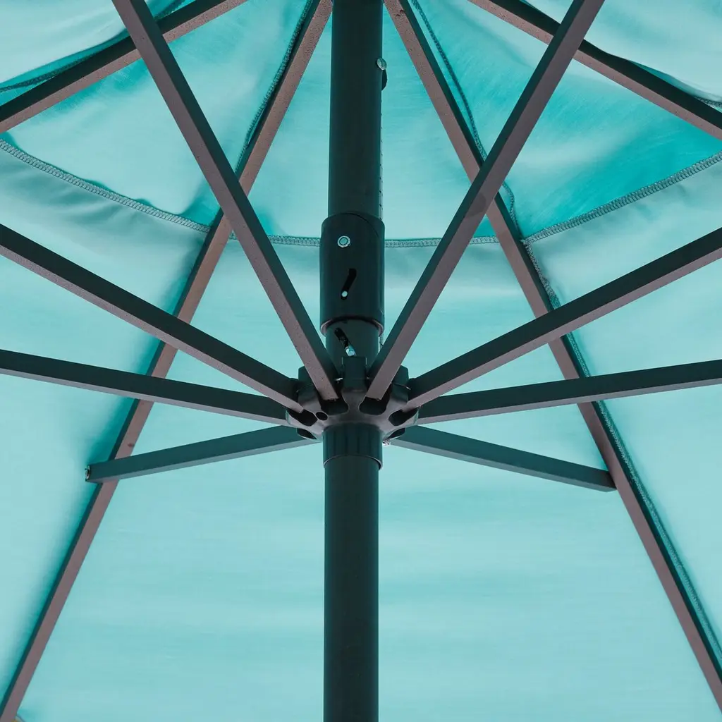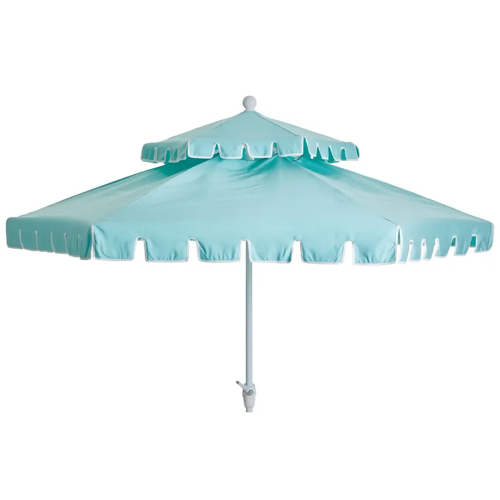 Designed by us and available only at One Kings Lane: Whether you're entertaining or just lounging outdoors, catch some shade in style with this patio umbrella. Its scalloped canopy is crafted from durable Sunbrella acrylic to protect against the elements, while its frame is made using a combination of sturdy aluminum and zinc plated steel and features a tilt-and-crank function. An umbrella base is not included but is required for use.