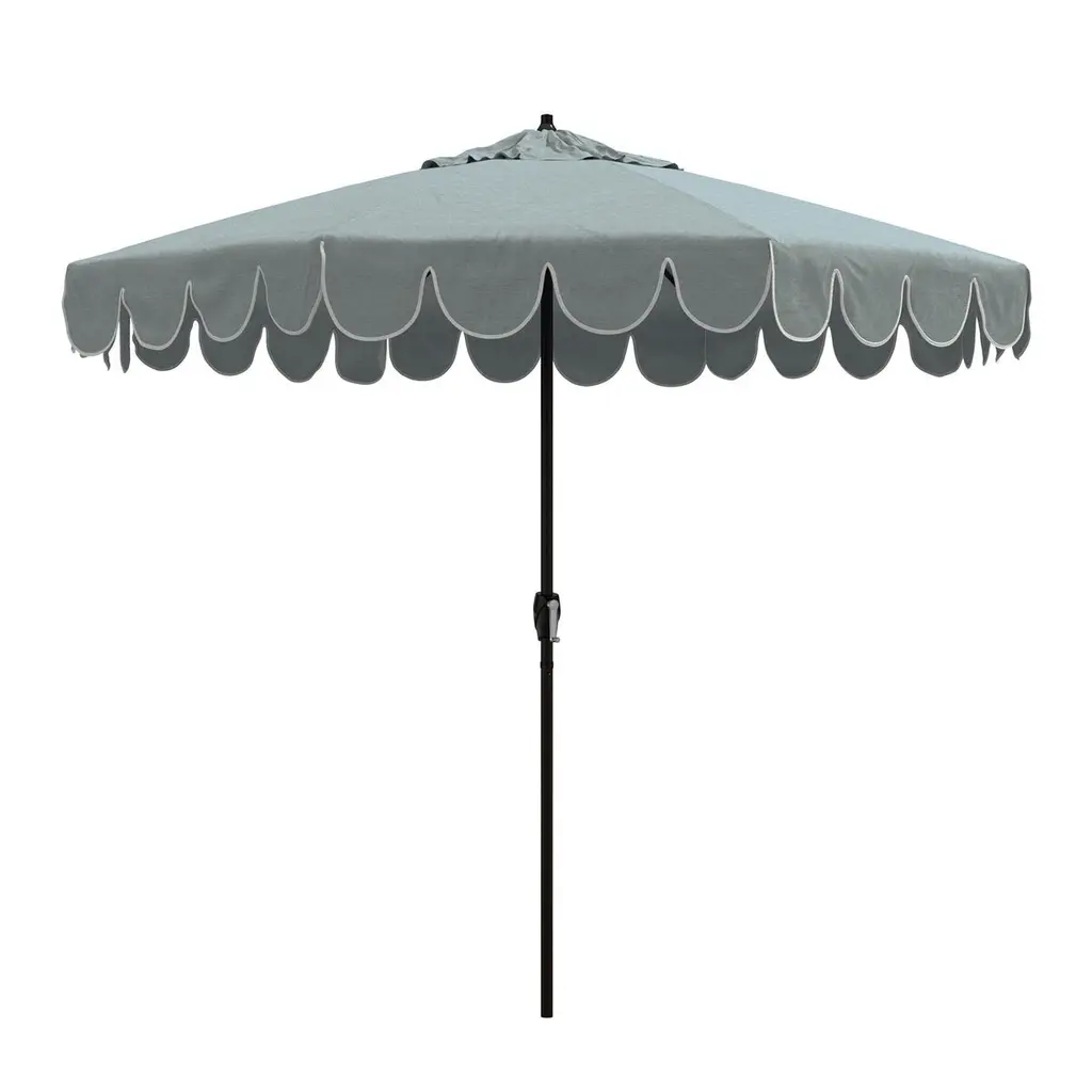 Designed by us and available only at One Kings Lane: Whether you're entertaining or just lounging outdoors, catch some shade in style with this patio umbrella. Its scalloped canopy is crafted from durable Sunbrella acrylic to protect against the elements, while its frame is made using a combination of sturdy aluminum and zinc plated steel and features a tilt-and-crank function. An umbrella base is not included but is required for use.
