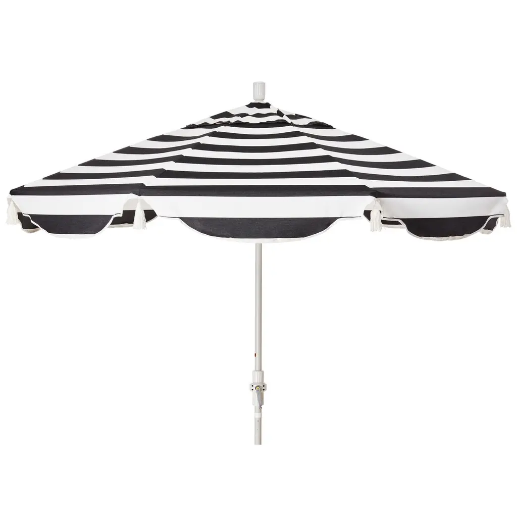 Designed by us and available only at One Kings Lane: Whether you're entertaining or just lounging outdoors, catch some shade in style with this patio umbrella. Its scalloped canopy is crafted from durable Sunbrella acrylic to protect against the elements, while its frame is made using a combination of sturdy aluminum and zinc plated steel and features a tilt-and-crank function. An umbrella base is not included but is required for use.