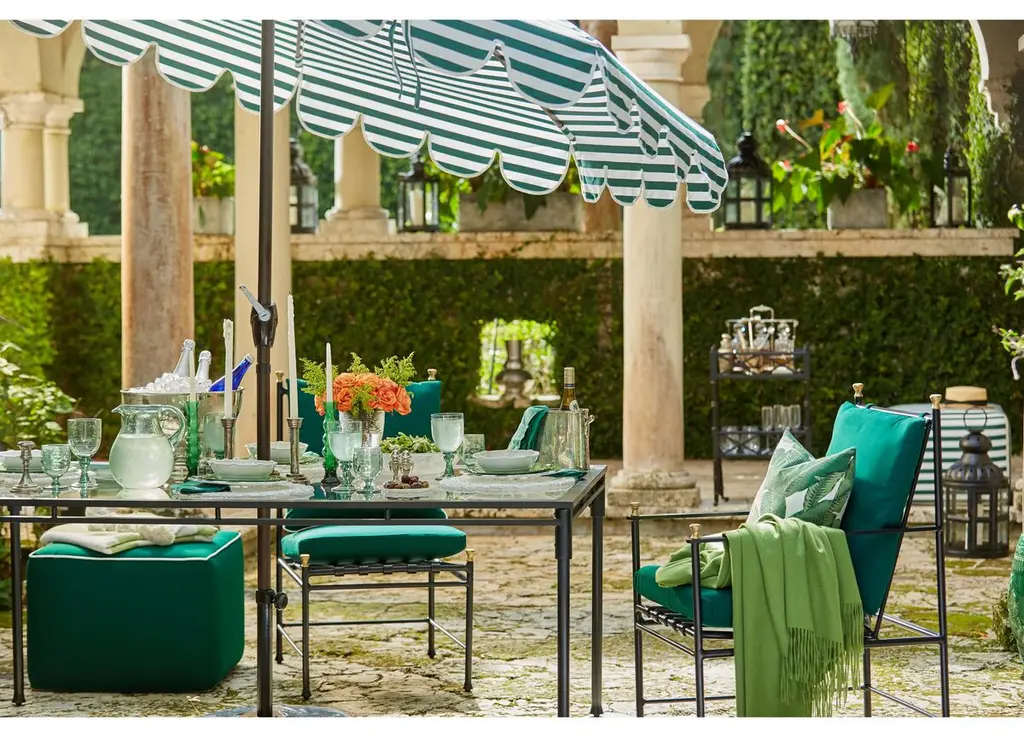 Designed by us and available only at One Kings Lane: Whether you're entertaining or just lounging outdoors, catch some shade in style with this patio umbrella. Its scalloped canopy is crafted from durable Sunbrella acrylic to protect against the elements, while its frame is made using a combination of sturdy aluminum and zinc plated steel and features a tilt-and-crank function. An umbrella base is not included but is required for use.