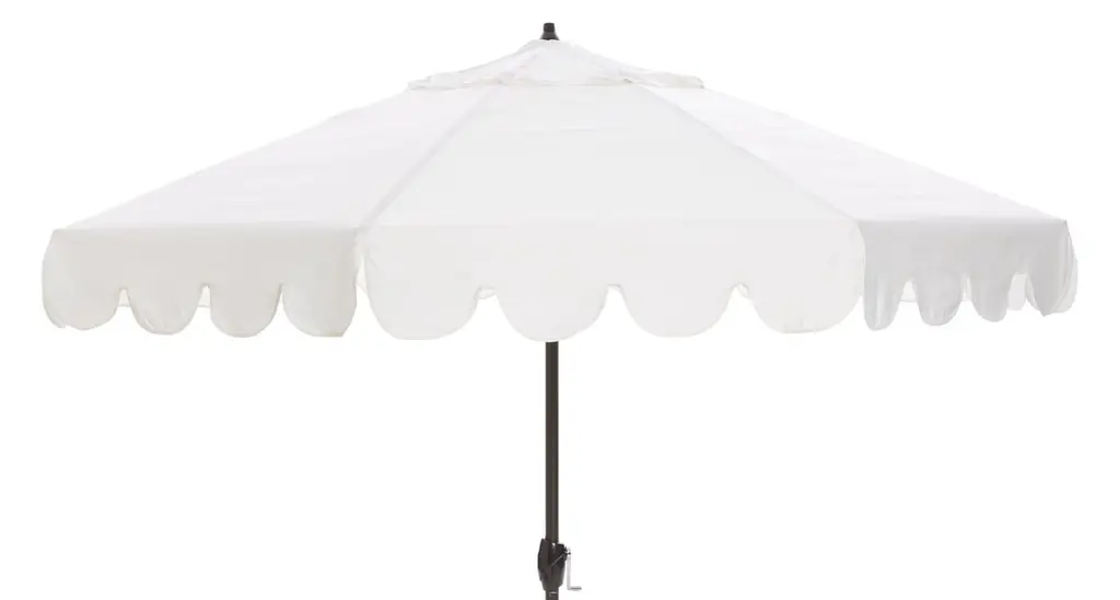 Designed by us and available only at One Kings Lane: Whether you're entertaining or just lounging outdoors, catch some shade in style with this patio umbrella. Its scalloped canopy is crafted from durable Sunbrella acrylic to protect against the elements, while its frame is made using a combination of sturdy aluminum and zinc plated steel and features a tilt-and-crank function. An umbrella base is not included but is required for use.