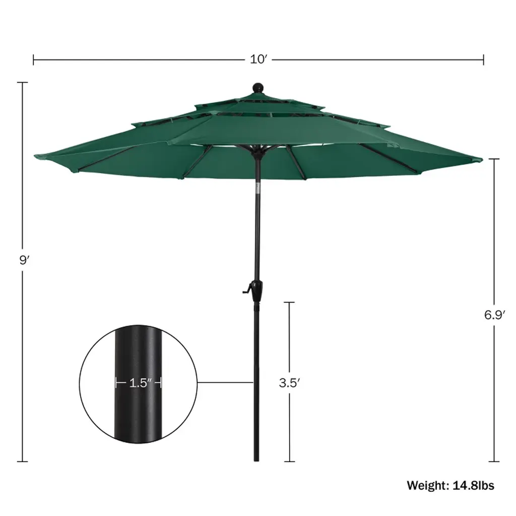 The 10ft Sun Umbrella Outdoor Patio Shade by Pure Garden is an attractive piece of outdoor décor that provides quality shade whether you’re entertaining guests on the deck or lounging by your swimming pool. The easy-to-use hand crank opens and closes the pool umbrella in seconds while the convenient push button tilt feature blocks angled sunlight, so you can relax in the shade even as the sun moves over the course of a hot summer day. This durable patio canopy is made with high-quality 180 GSM polyester fabric, 8 powder-coated steel ribs, and a sturdy steel pole that fits patio tables or umbrella bases designed for poles with a 1.5-inch diameter.