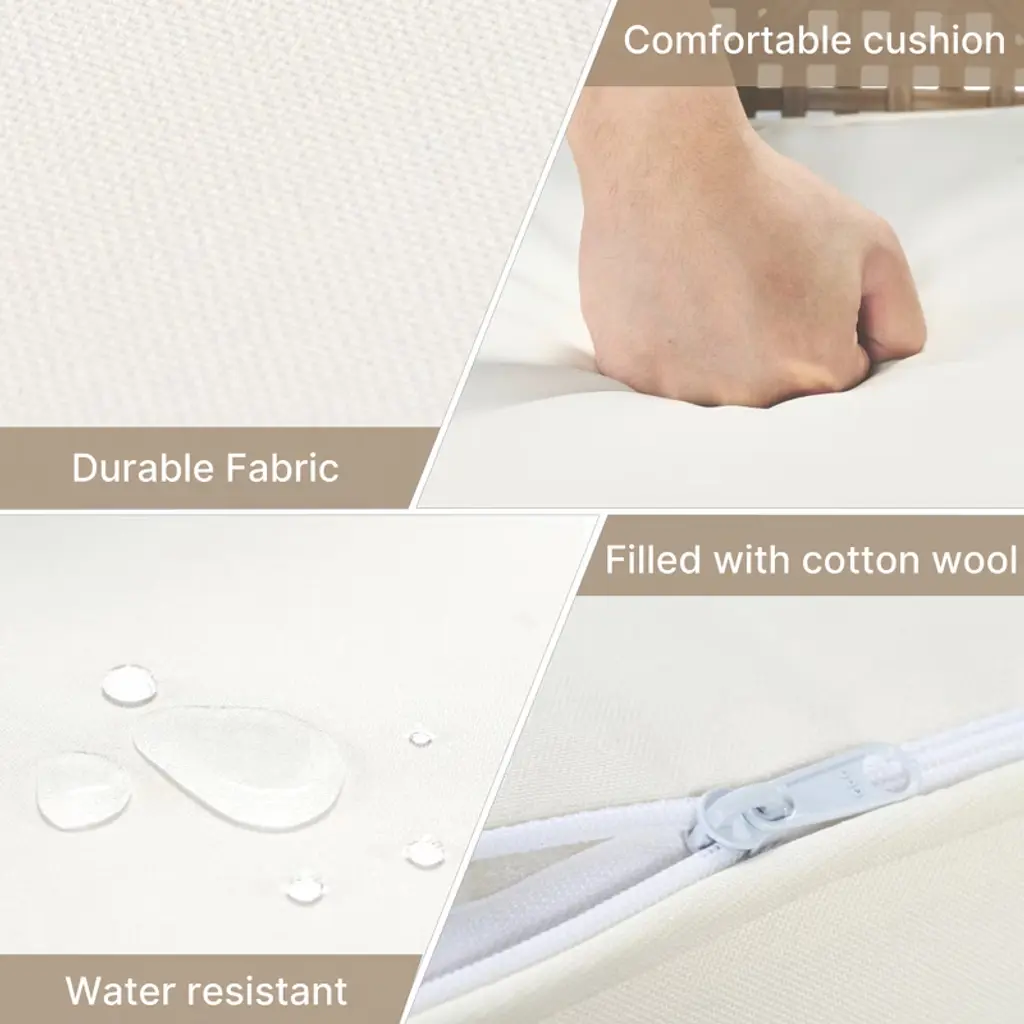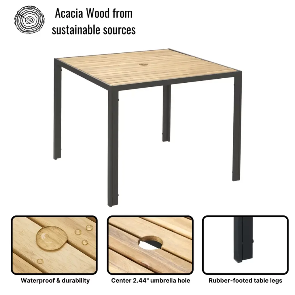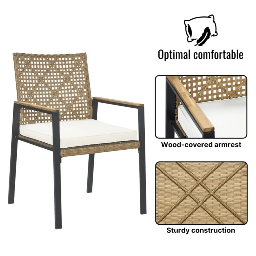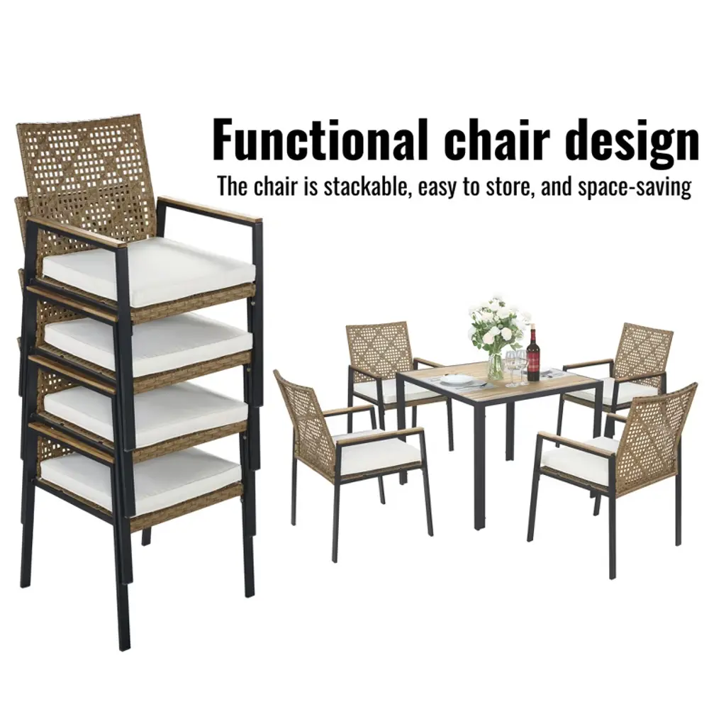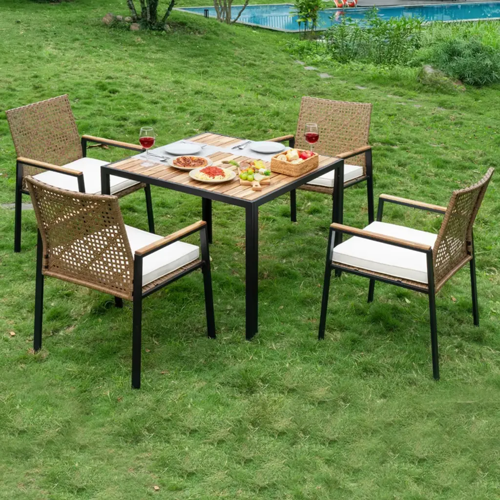 This modern outdoor dining furniture set combines natural aesthetics with practical functions to create an elegant and comfortable leisure space for your terrace, balcony or garden. Made of high-quality PE rattan, rust-proof powder-coated frame and sturdy solid acacia wood, it is durable and can withstand all kinds of weather challenges. The large table and chair design with ergonomic backrest and thick foam pads allows you to enjoy a pleasant outdoor dining time with family and friends. Whether it is an afternoon nap or a night party, this set of stylish and durable furniture can add more comfort and style to your outdoor life.