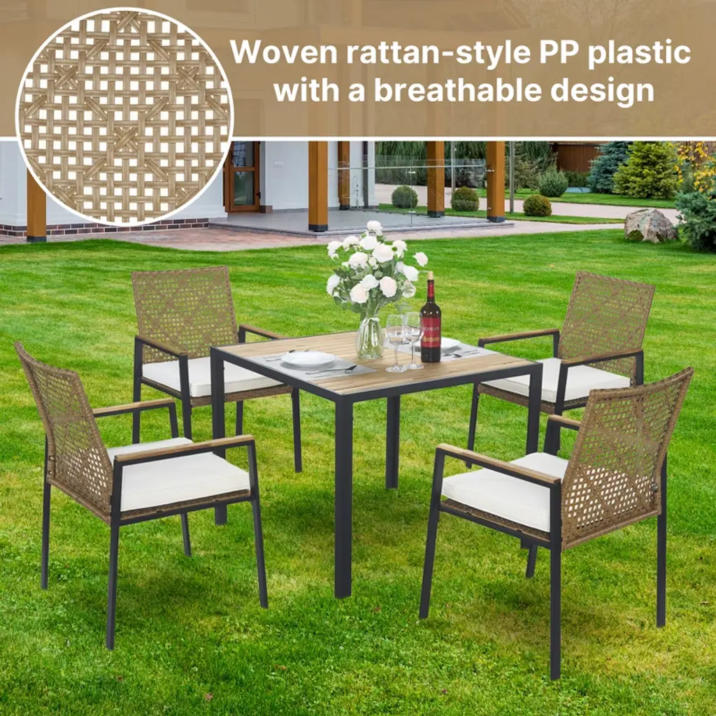 Rbied All Weather 5-piece Wicker Outdoor Dining Set Patio Conversation Set With White Cushions And 2.44" Umbrella Hole