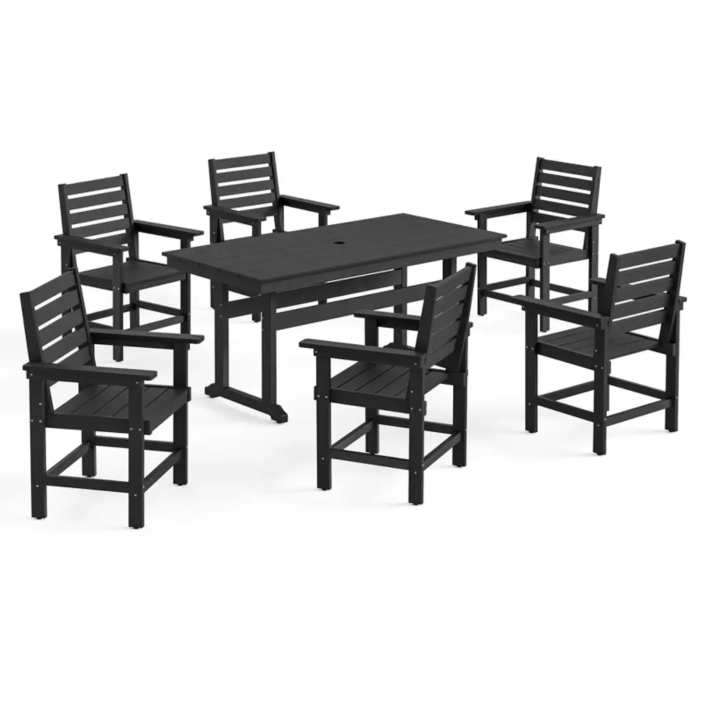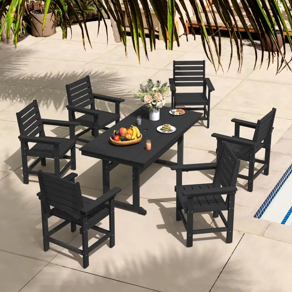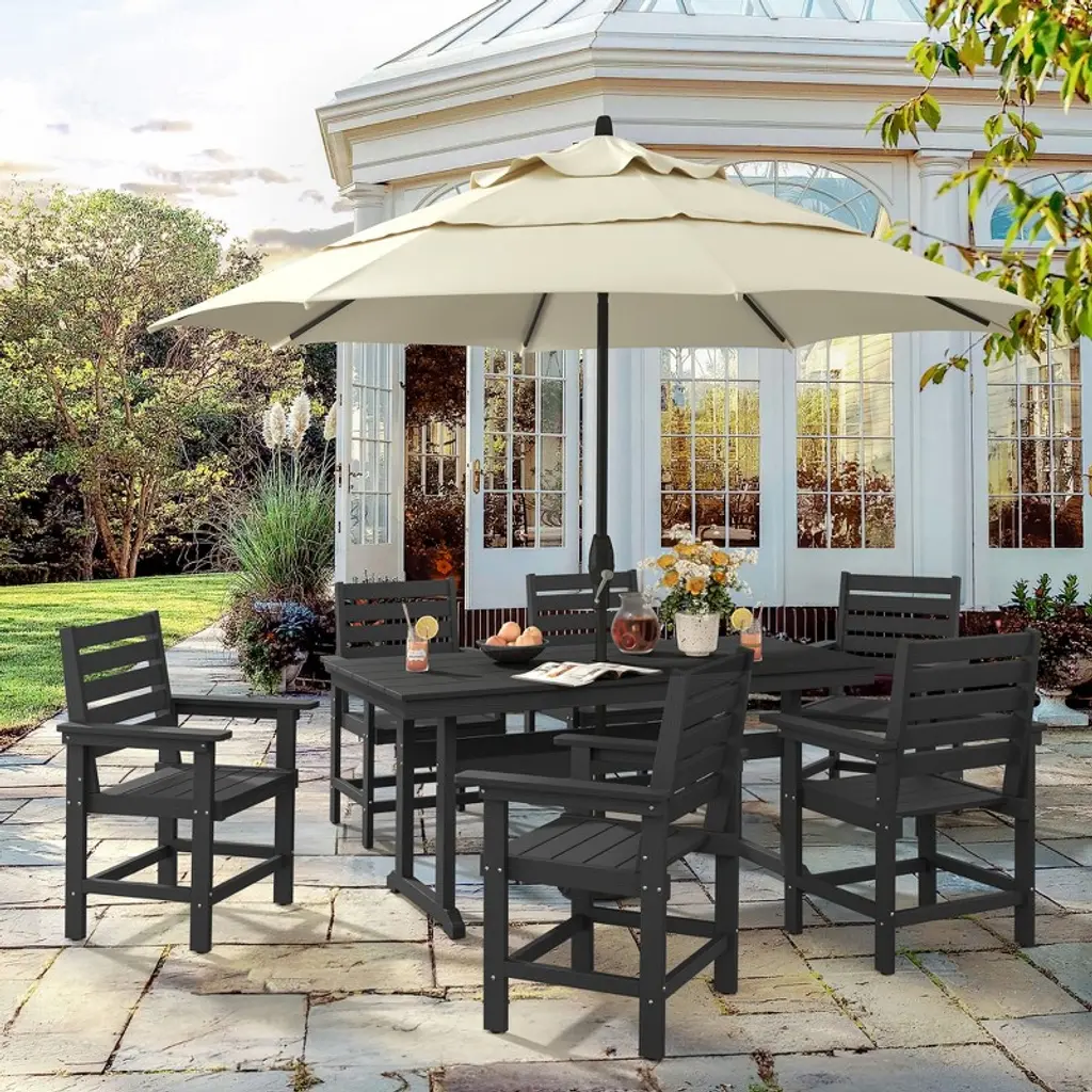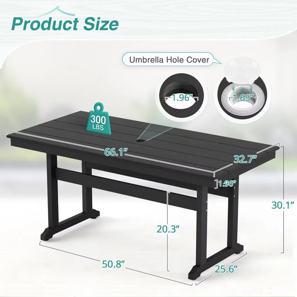 All Weather Applicable: The outdoor dining tables are made of HDPS material and 304 stainless steel screws, which are water-resistant, rainproof, and windproof, durability without fading or peeling Low Maintenance: When you see dirt or grime accumulate, simply clean your patio dining table with warm water and a soft bristle brush to have them shining like new, it allows you to have more time to enjoy your time Table Size: The dimensions of the outdoor dining table are 66"L x 32.7"W x 30"H and can seat up to 6 people, at least 3 feet of clearance on all sides of the dining table to give guests a room to walk by and pull out their chairs About Umbrella Size: The pre-drilled 1.96" umbrella hole is compatible with most umbrellas, allowing you to enjoy different views during the summer and rainy days Easy to Assemble: The outdoor table assembly time is less than 30 minutes, and all the necessary hardware and easy-to-follow instructions are included in the package, also watch the assembled video