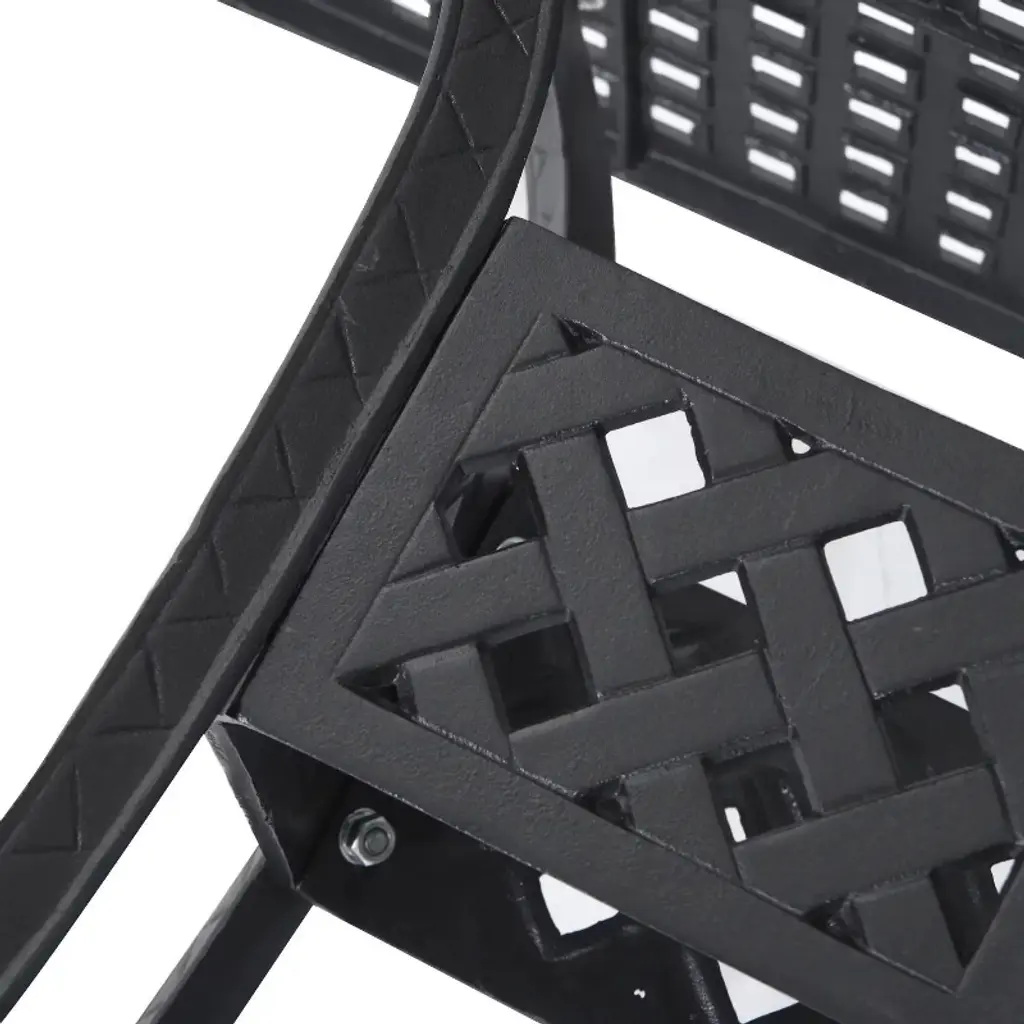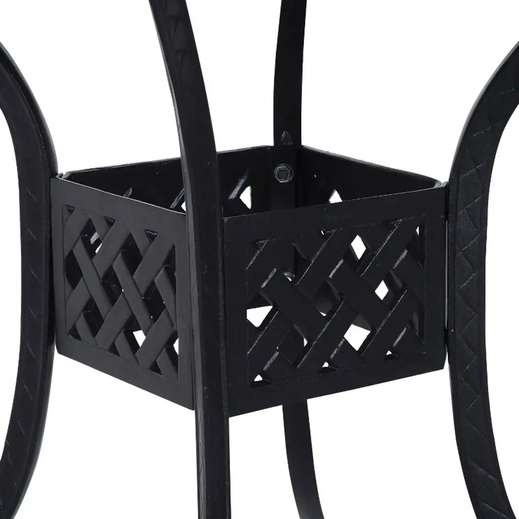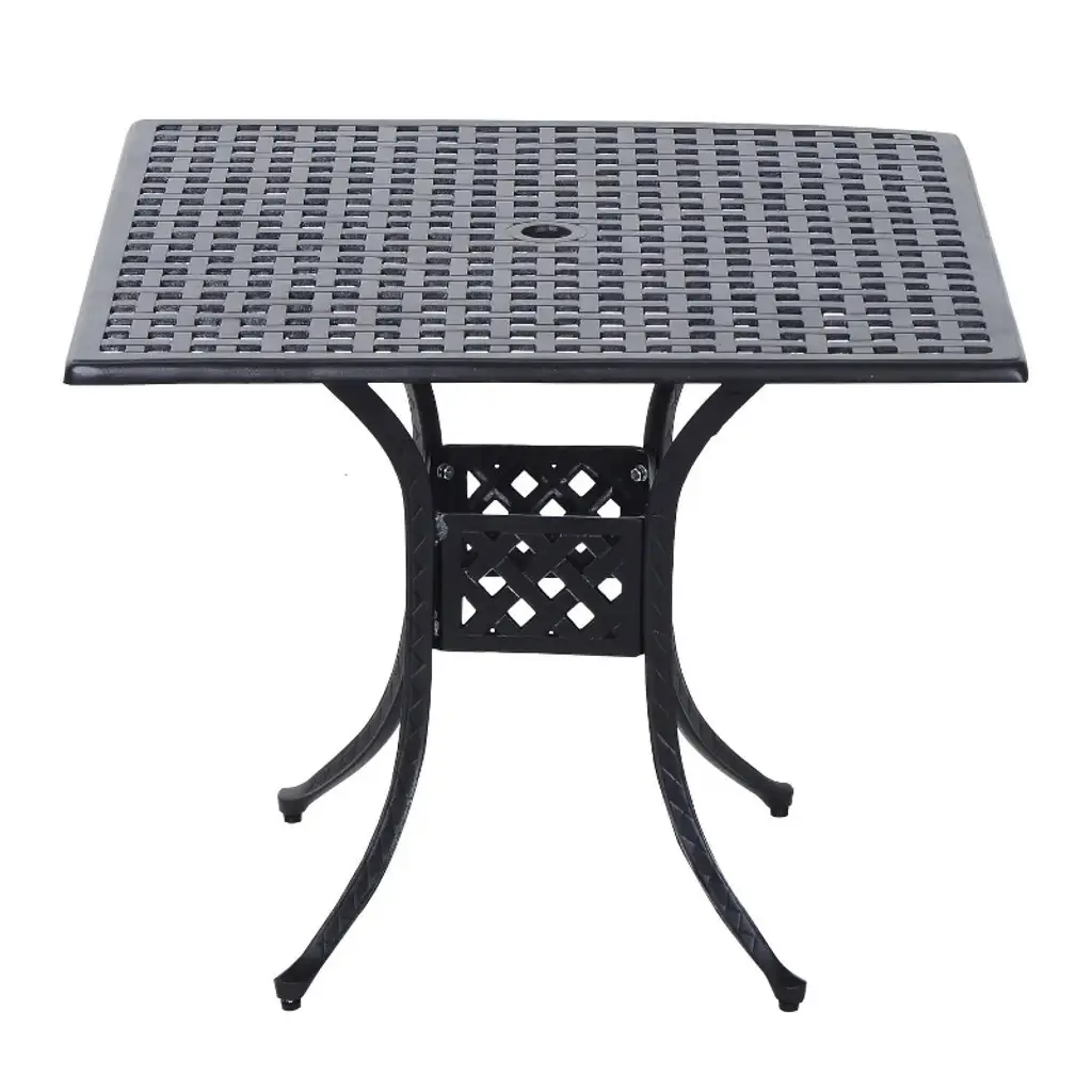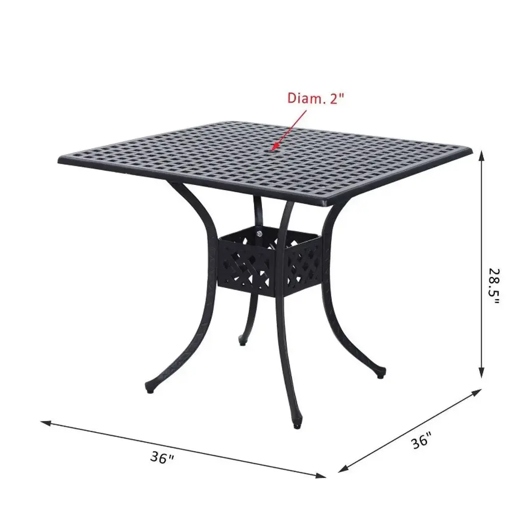 Introducing the Resenkos Outdoor Dining Table – the ultimate solution for a cozy outdoor meal with up to four guests. Crafted with weather-resistant cast aluminum, this grid motif dining table is both stylish and durable, perfect for year-round use. Its center umbrella hole allows for seamless sun protection, while the footpads prevent surface scratching. Pair it with any of our store's seating options to create your ideal outdoor space. Embrace the outdoors, relax, and enjoy the Resenkos difference. Key Features: Grid motif metal-work dining table, Weather-resistant cast aluminum, Lightweight yet outdoor-ready, Center umbrella hole, Footpads to prevent surface scratching, Versatile seating options available. Specifications: Color: Black, Material: Cast Aluminum, Overall Dimensions: 36" L x 36" W x 28.5" H, Umbrella Hole Diameter: 2" Dia, Fixed Frame Height: 5.5" H, Frame to Floor: 12.25" W, Net Weight: 30 lbs., Weight Capacity: 240 lbs. Package Includes: 1 x Patio Table, 1 x Manual