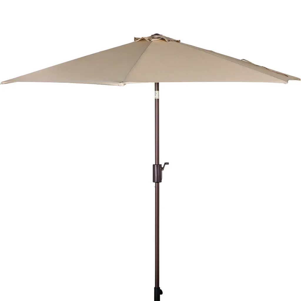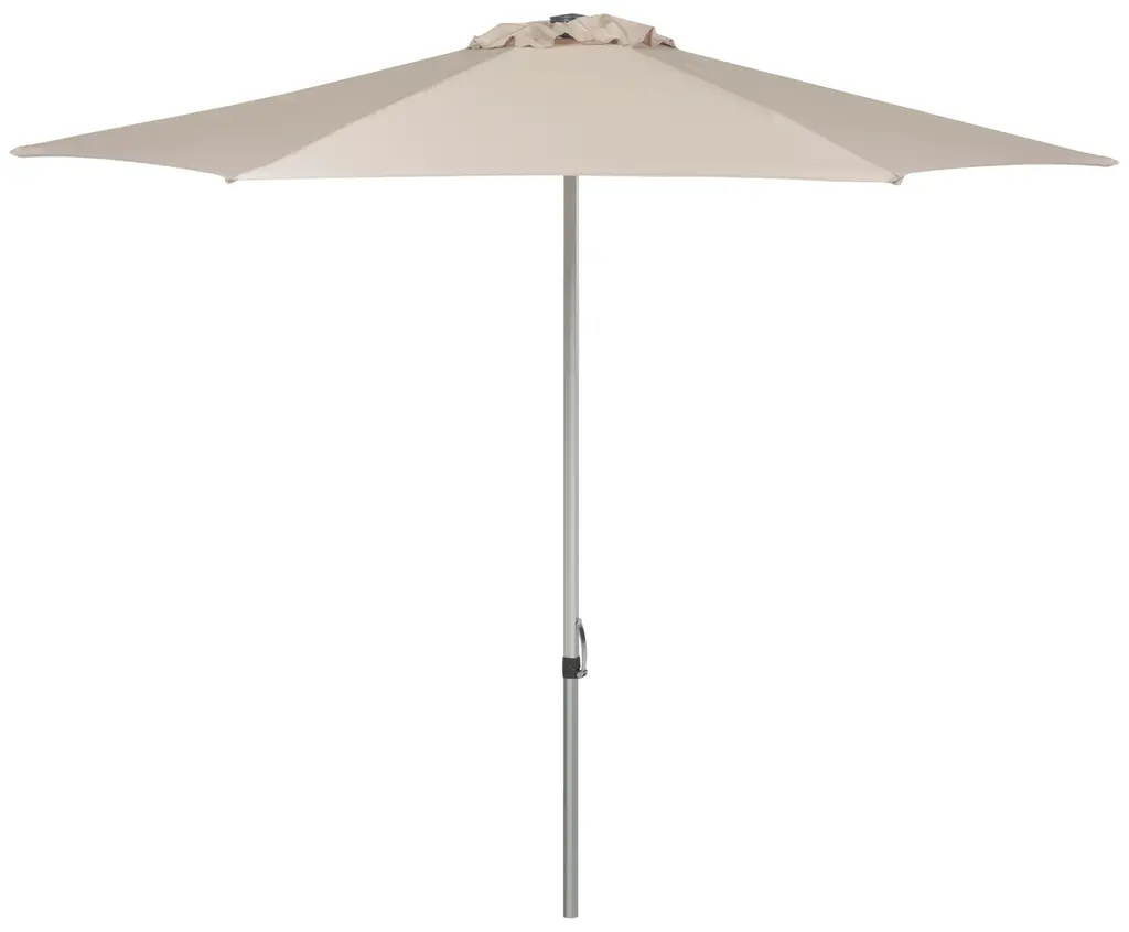 Create a shady oasis on the patio or poolside with this push-up umbrella in the style used in Europe everywhere from farmer’s markets to posh hotels. This classic design features a nine-foot polyester canopy in beige and brown aluminum and steel frame. Includes easy glide mechanism. Store outdoor furniture indoors or cover well when not in use. Remove wooden furniture from standing water. Dust regularly with small brush or vacuum. Spills should be taken care of immediately before they harden or stain with a slightly dampened sponge. Do not use bleach solutions. Some assembly required.