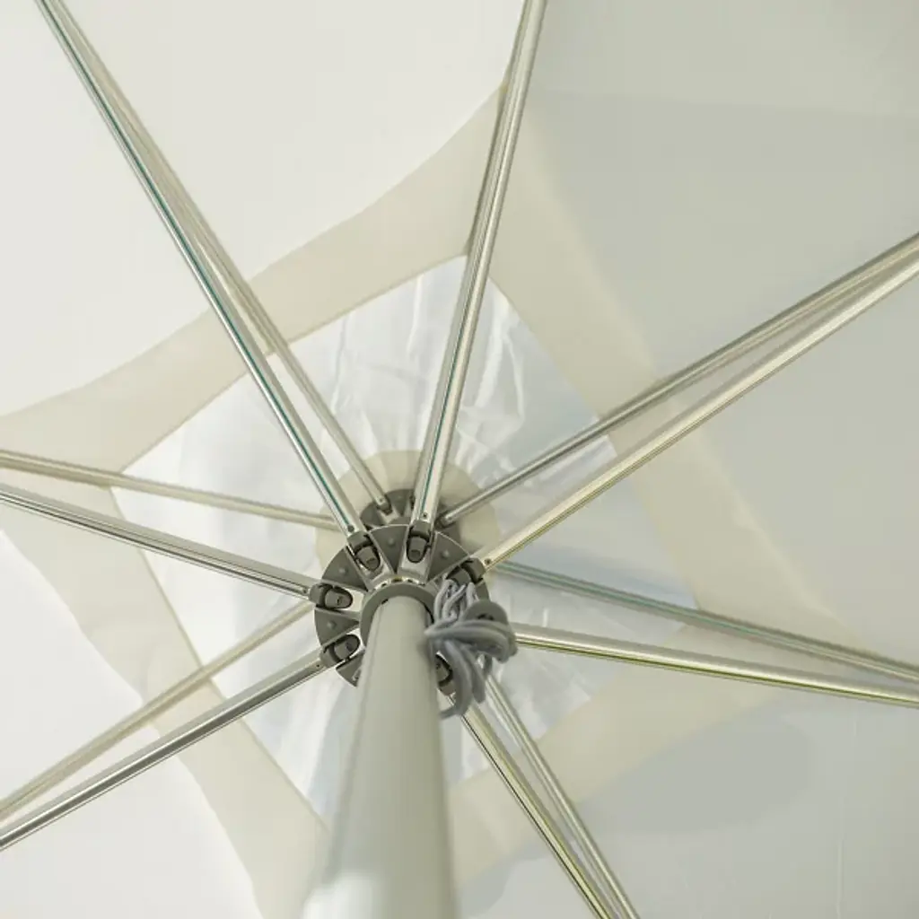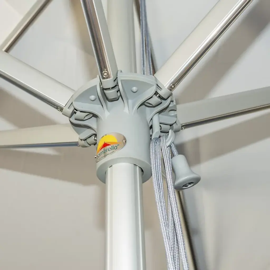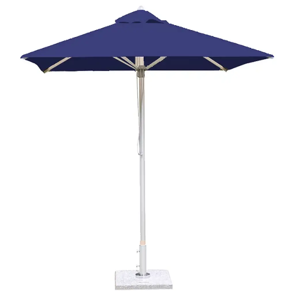Bring a wide-reaching shade to your open-air areas with the Santa Ana Square Umbrella from Bambrella. A clever contemporary construction, the central pole and arms are made from durable and rust-resistant aluminum, held within a nylon hub and runner actuated by a patented cleat system instead of a holding pin to open the sturdy Spuncrylic shade at a variety of heights. The pole itself breaks down into two pieces for easy storage and movement. The base itself must be purchased separately.