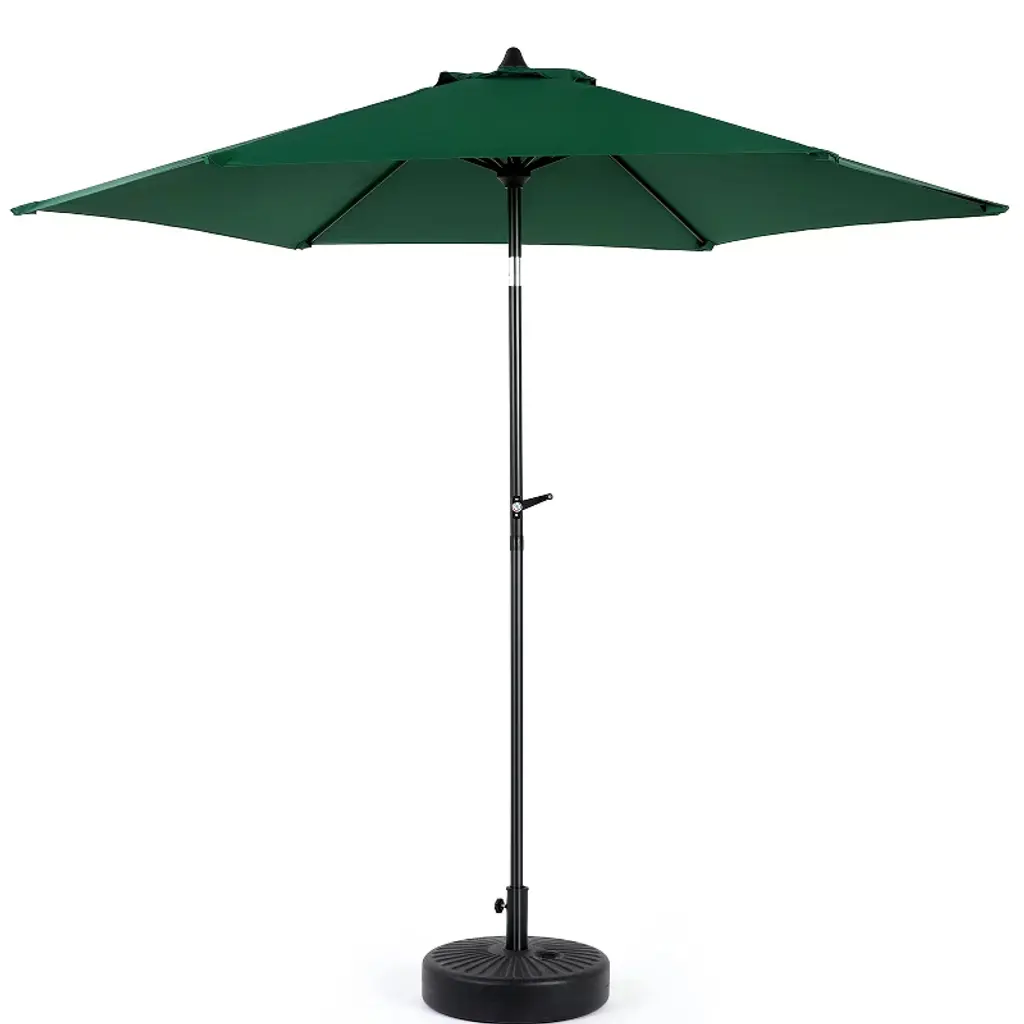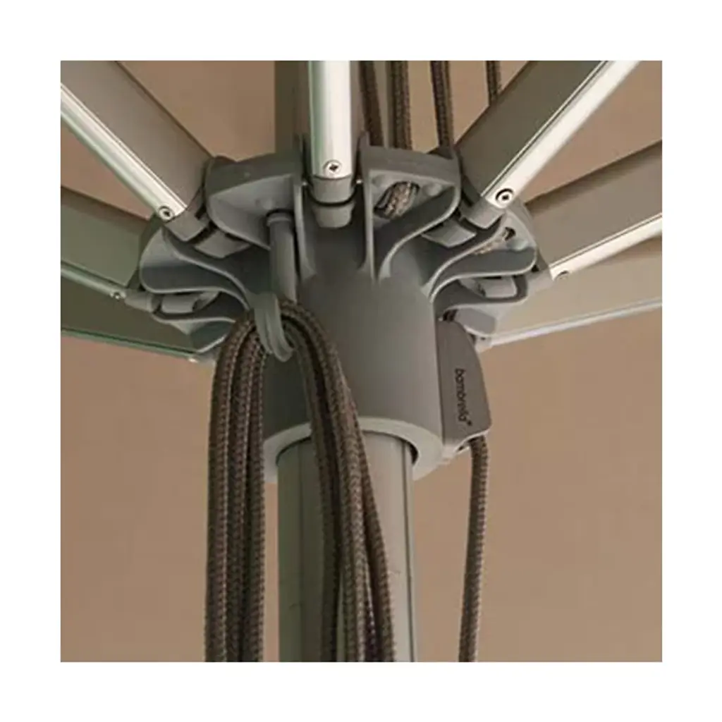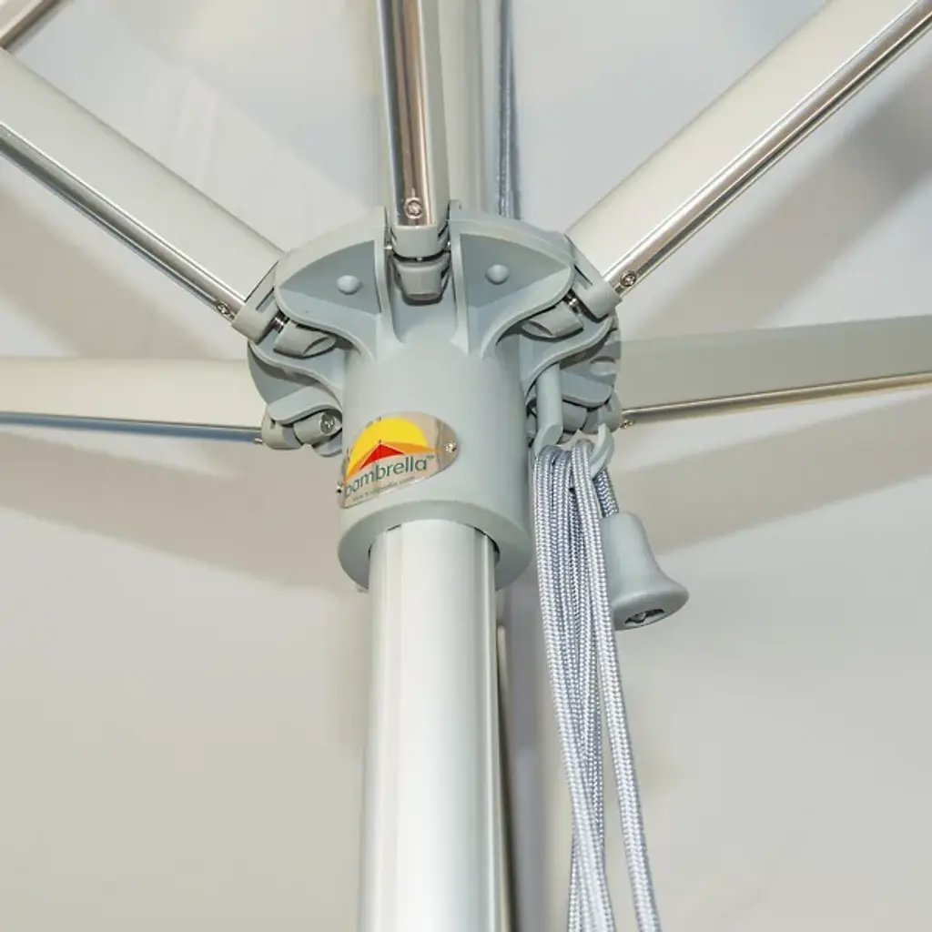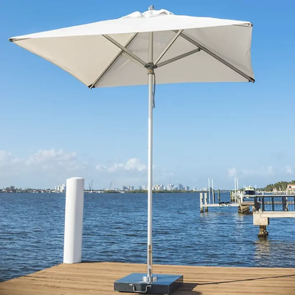 Bring a wide-reaching shade to your open-air areas with the Santa Ana Square Umbrella from Bambrella. A clever contemporary construction, the central pole and arms are made from durable and rust-resistant aluminum, held within a nylon hub and runner actuated by a patented cleat system instead of a holding pin to open the sturdy Spuncrylic shade at a variety of heights. The pole itself breaks down into two pieces for easy storage and movement. The base itself must be purchased separately.
