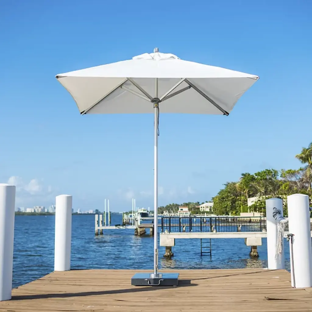 Bring a wide-reaching shade to your open-air areas with the Santa Ana Square Umbrella from Bambrella. A clever contemporary construction, the central pole and arms are made from durable and rust-resistant aluminum, held within a nylon hub and runner actuated by a patented cleat system instead of a holding pin to open the sturdy Spuncrylic shade at a variety of heights. The pole itself breaks down into two pieces for easy storage and movement. The base itself must be purchased separately.