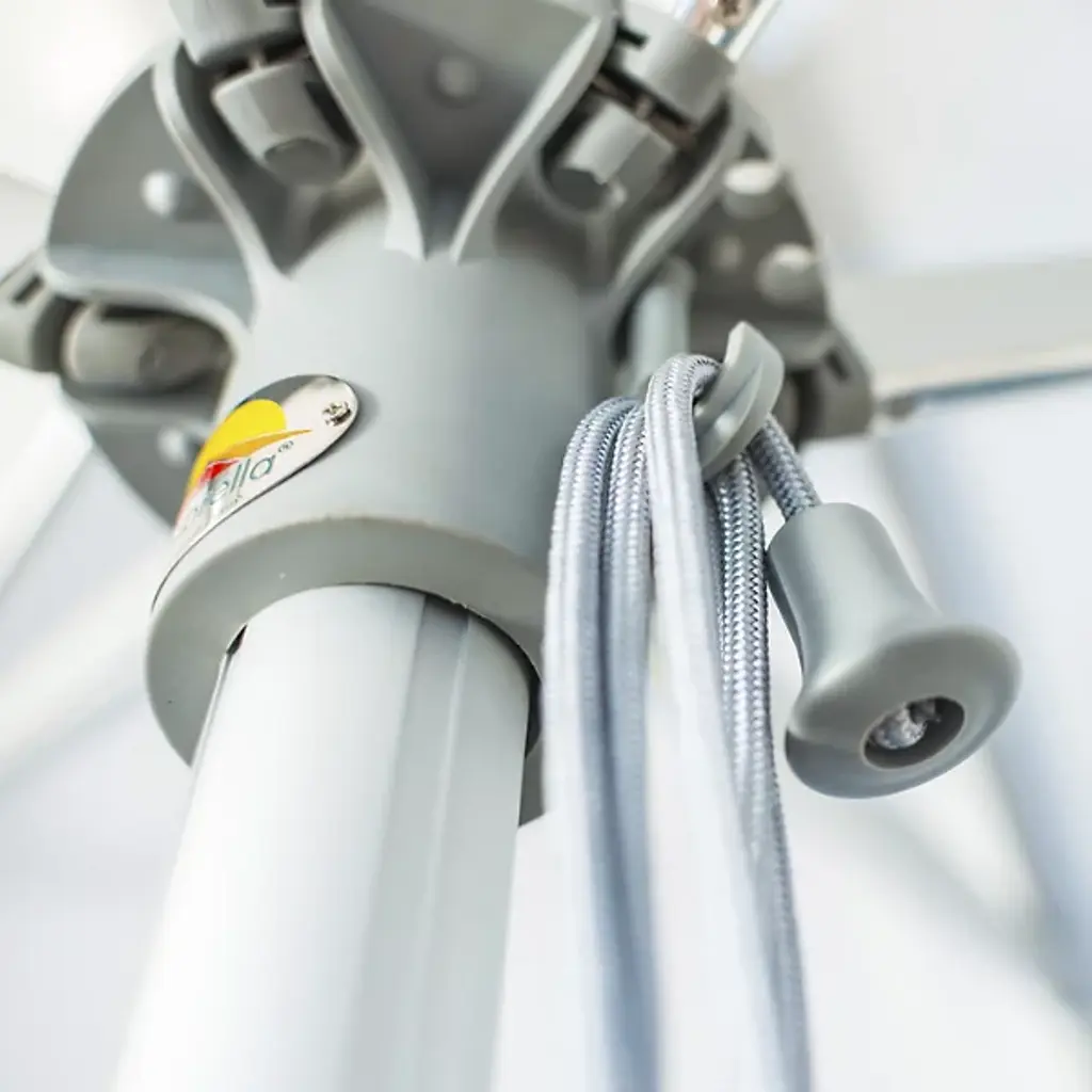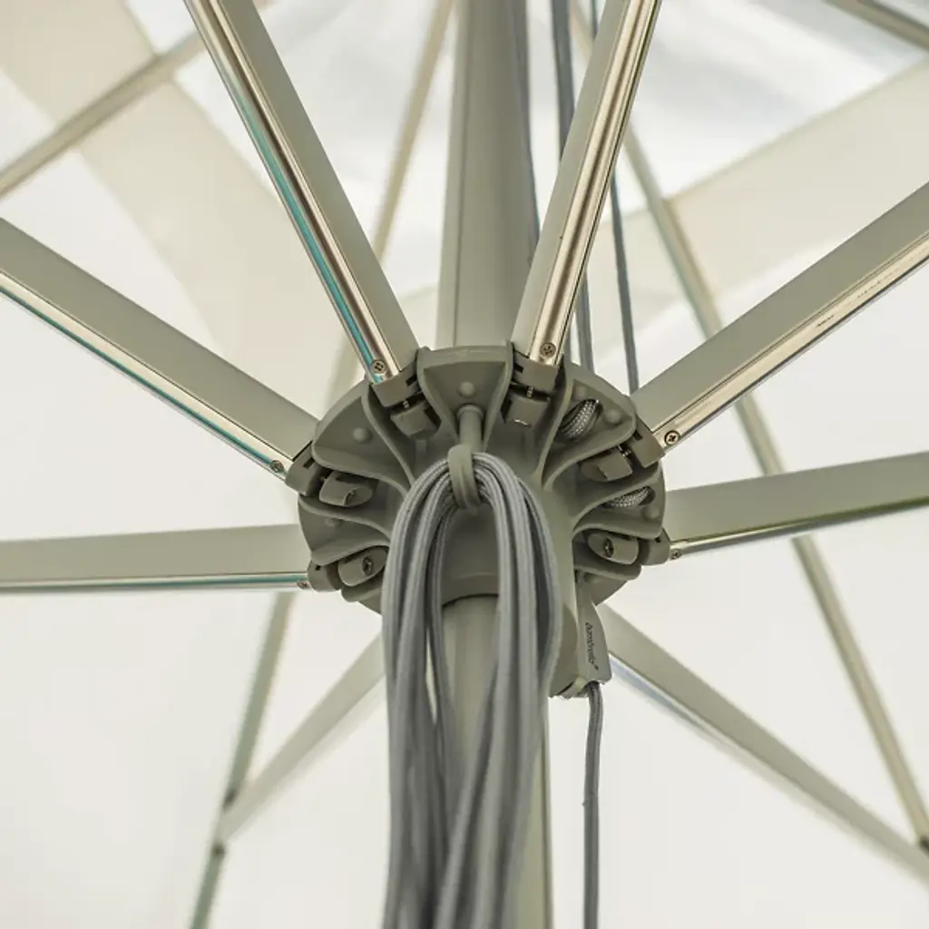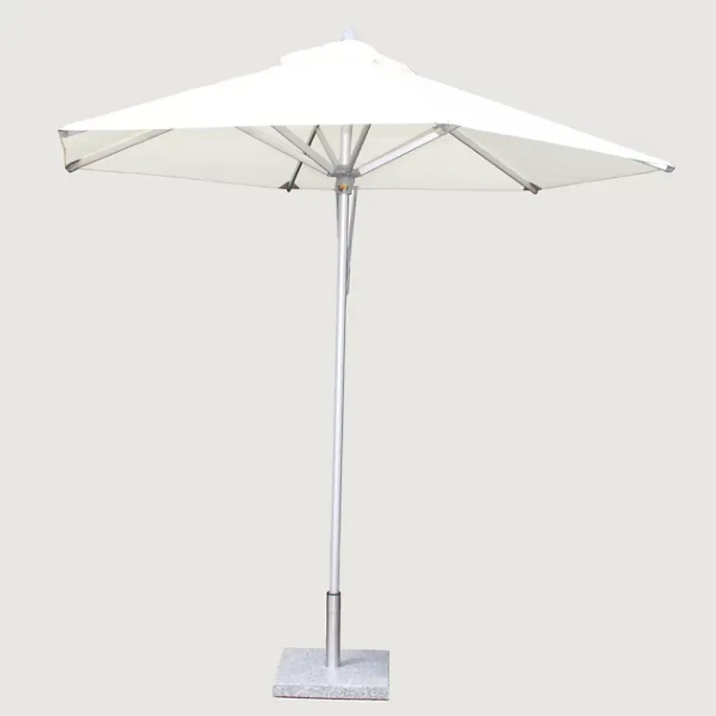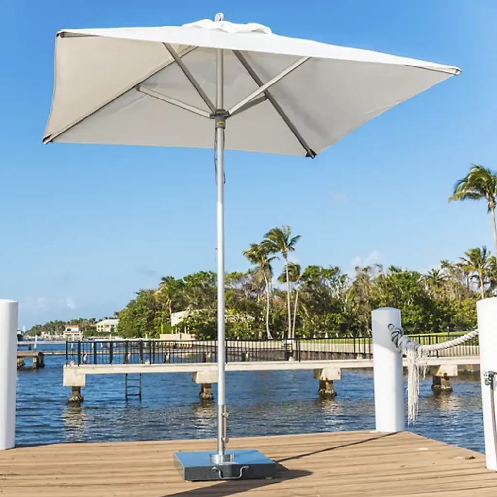 Bring a wide-reaching shade to your open-air areas with the Santa Ana Square Umbrella from Bambrella. A clever contemporary construction, the central pole and arms are made from durable and rust-resistant aluminum, held within a nylon hub and runner actuated by a patented cleat system instead of a holding pin to open the sturdy Spuncrylic shade at a variety of heights. The pole itself breaks down into two pieces for easy storage and movement. The base itself must be purchased separately.