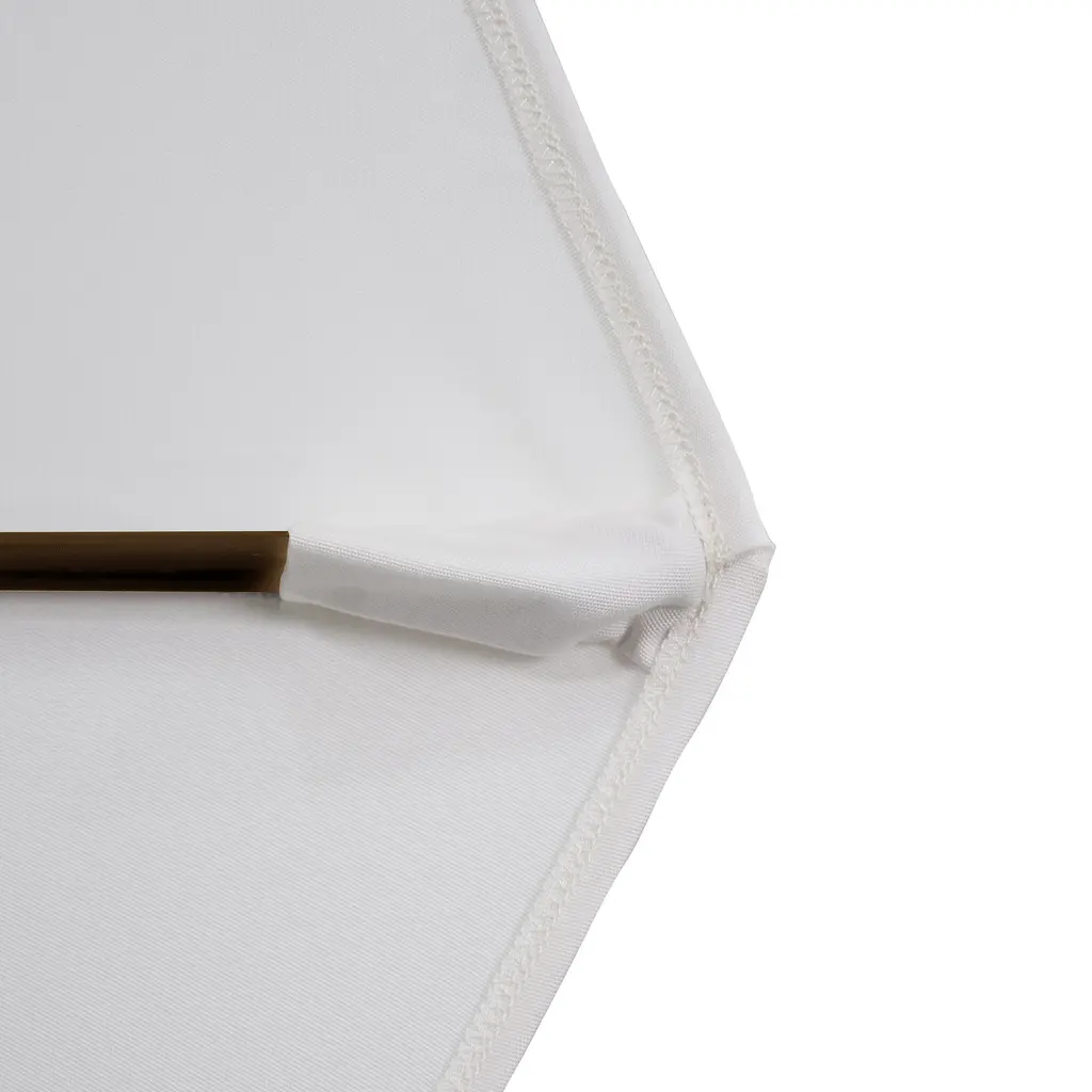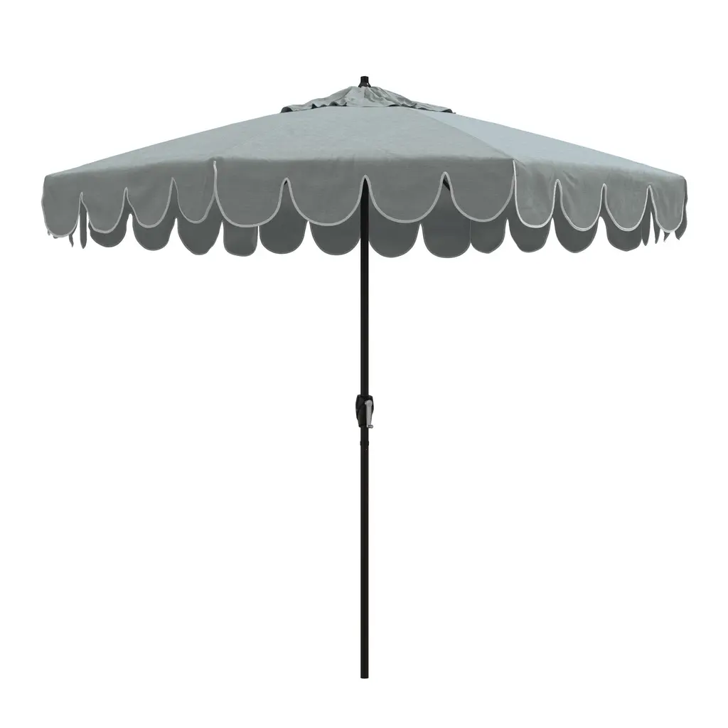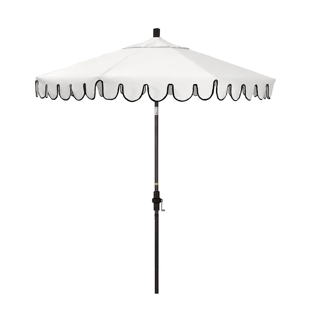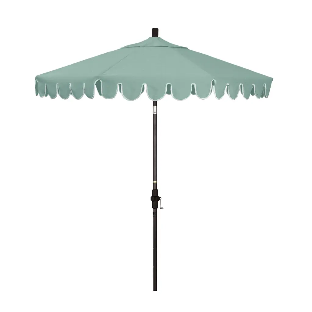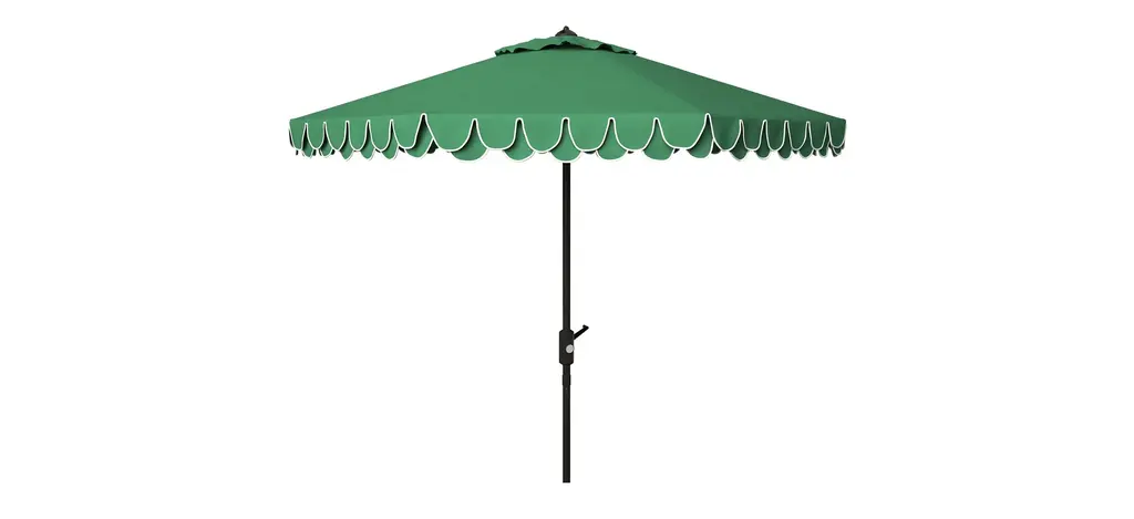 Scalloped edge canopy is made from weather- and UV-resistant Sunbrella®. Ample shade to keep you cool at a table or while relaxing on a lounger. Opens easily with a crank lift mechanism.