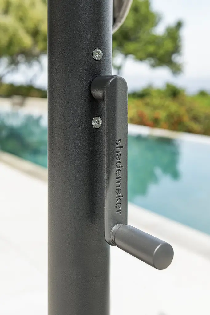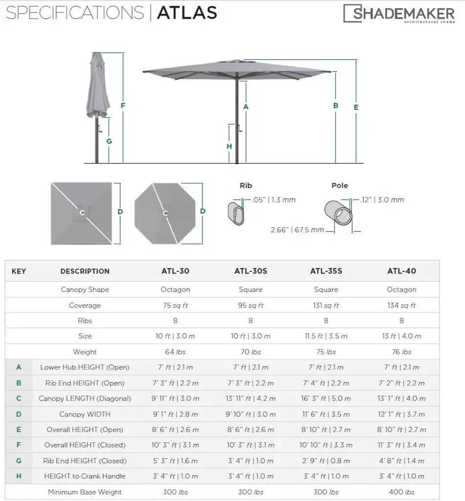 With its simplistic design and ease of use, the Atlas provides luxurious shade and comfort. This telescoping umbrella allows for unobstructed closure over tables and chairs with a few simple rotations of the removable crank handle. An ideal solution for most shade applications.The architectural essence of Shademaker umbrellas began with a unified design, forms, and structure. From this foundation, Shademaker elevates its offering of signature looks by introducing well-crafted styles with advanced functionality and durable materials. Every umbrella embodies true beauty and elegance.Titan Base Note: The Titan Bases hold up to 32 concrete pavers (12”x12”x1.5”). Both are sold separately.