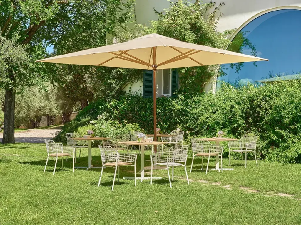 Piazza Signoria by EMU D&S Lab is a sunshade with a beechwood frame, perfect for creating a classic atmosphere where wood becomes a stylistic choice, pairing well with the other wood collections or in multi-material combinations. Available in three different sizes, this sunshade stands out for its use of cutting-edge aluminium structural components, ensuring durability and functionality.