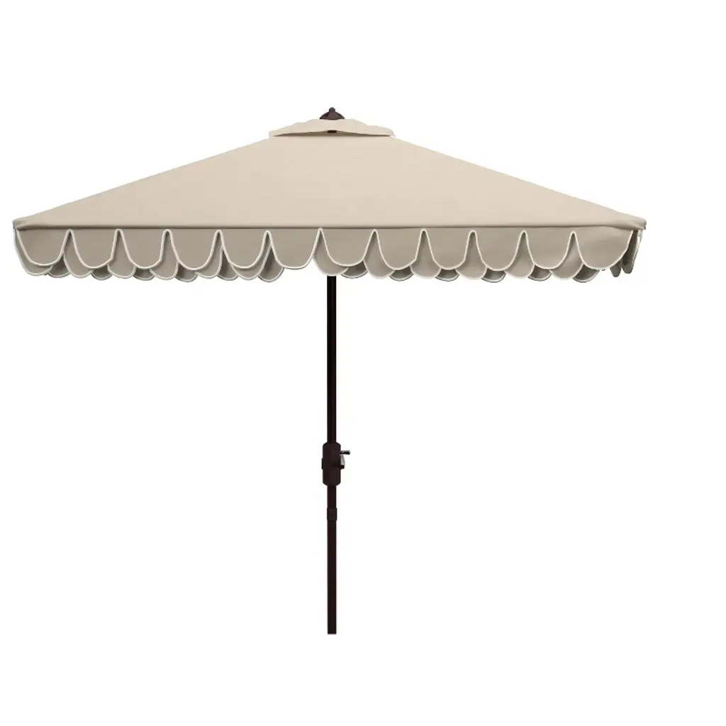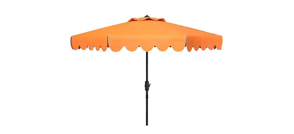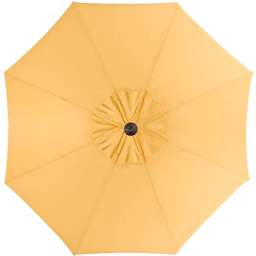 The signature white and blue coloration of Santorini’s lush legendary resort inspired this nine-foot crank umbrella. it's sophisticated yellow hue features a single scallop white trim to create a outdoor retreat for the modern tastemaker. Store outdoor furniture indoors or cover well when not in use. Remove wooden furniture from standing water. Dust regularly with small brush or vacuum. Spills should be taken care of immediately before they harden or stain with a slightly dampened sponge. Do not use bleach solutions. Some assembly required.