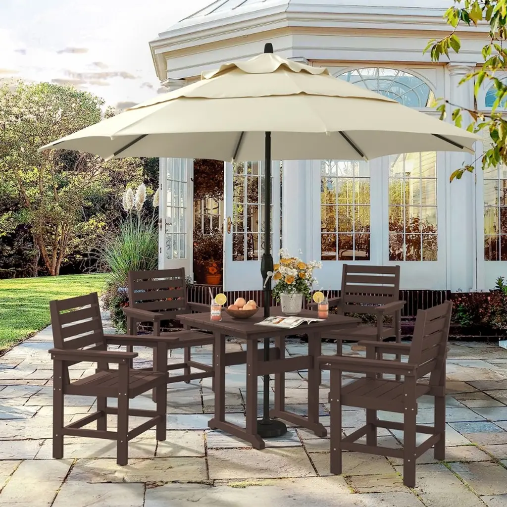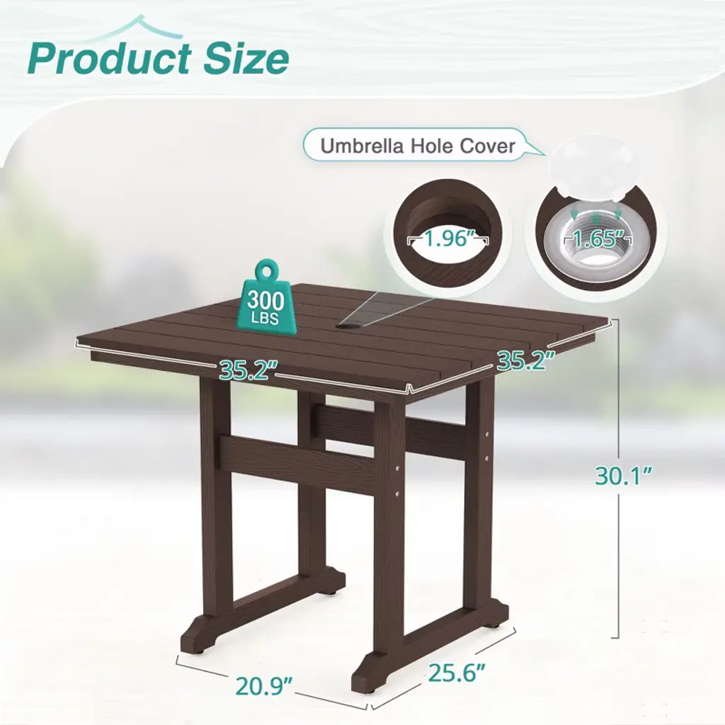 All Weather Applicable: The outdoor dining tables are made of HDPS material and 304 stainless steel screws, which are water-resistant, rainproof, and windproof, durability without fading or peeling Low Maintenance: When you see dirt or grime accumulate, simply clean your patio dining table with warm water and a soft bristle brush to have them shining like new, it allows you to have more time to enjoy your time Table Size: The dimensions of the outdoor backyard square table are 35.2"L x 35.2"W x 30"H and can seat up to 4 people, at least 3 feet of space on all sides of a dining table to give guests a room to walk by and pull out their chairs About Umbrella Size: The pre-drilled 1.96" umbrella hole is compatible with most umbrellas, allowing you to enjoy different views during the summer and rainy days Easy to Assemble: The outdoor table assembly time is less than 30 minutes, and all the necessary hardware and easy-to-follow instructions are included in the package, also watch the assembled video