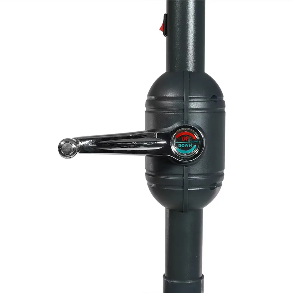 This solar patio umbrella has everything needed to enjoy time outdoors and out of the sun. The tilt and crank functionality can conveniently position the umbrella at just the right angle and makes it easy to close and open it. The umbrella features a solar panel that powers the 24 LED lights located on the steel ribs, making socializing or relaxing under the umbrella day or night enjoyable. The lights operate via a switch on the upper crank housing. When fully charged via solar power, the lights will last 8-10 hours. The large 9' umbrella diameter makes it a great size for any 42"-54" outdoor dining table and chairs. With a standard 1.5" diameter pole, use the patio table umbrella with solar lights with any standard umbrella base (not included) and dining set (not included). In addition, the umbrella is engineered to last with a black, powder-coated aluminum pole for resistance to rust, steel ribs for maximum support, and 100% polyester fabric for the umbrella for extra durability.• PROVIDES OPTIMAL SHADE: This outdoor table umbrella measures 9' in diameter x 7.5' (91") H and has a 1.5" diameter pole. The large amount of shade this umbrella provides is enough to cover a 42-54" table.• DURABLE DESIGN: The outdoor patio umbrella with lights is designed for weather resistance and lasting use. The umbrella is made with a 100% polyester fabric canopy, 8 powder-coated steel ribs, and a powder-coated aluminum pole. The steel ribs provide long-lasting stability to the canopy.• PRACTICAL SHADE ADJUSTMENT: The patio market umbrella features a push-button tilt to adjust the canopy's angle throughout the day. Use the crank to smoothly open and close the canopy. Secure the canopy closed with the attached fabric ties. A vent in the canopy allows for cool air circulation, reduces wind pressure, and increases stability.• SOLAR-POWERED ILLUMINATION: The solar patio umbrella features 3 solar-powered white LED lights on each rib to create a warm, inviting atmosphere without the need for extra wiring. The LED lights feature a 12,000 mcd brightness with a Kelvin color temperature of approximately 3000K. When fully charged, the LED lights can last 6-8 hours. Use the switch on the pole to turn the lights on and off.• WORRY-FREE PURCHASING: Sunnydaze Decor backs its products with a 1-year manufacturer's warranty.