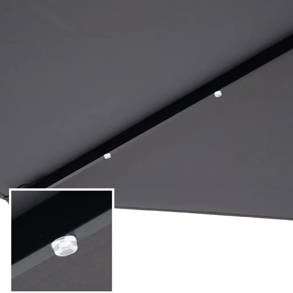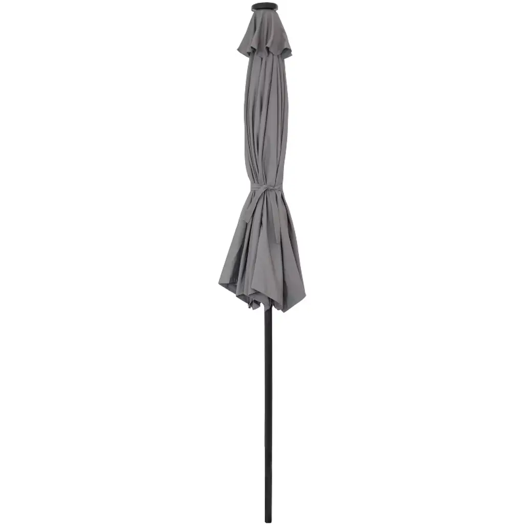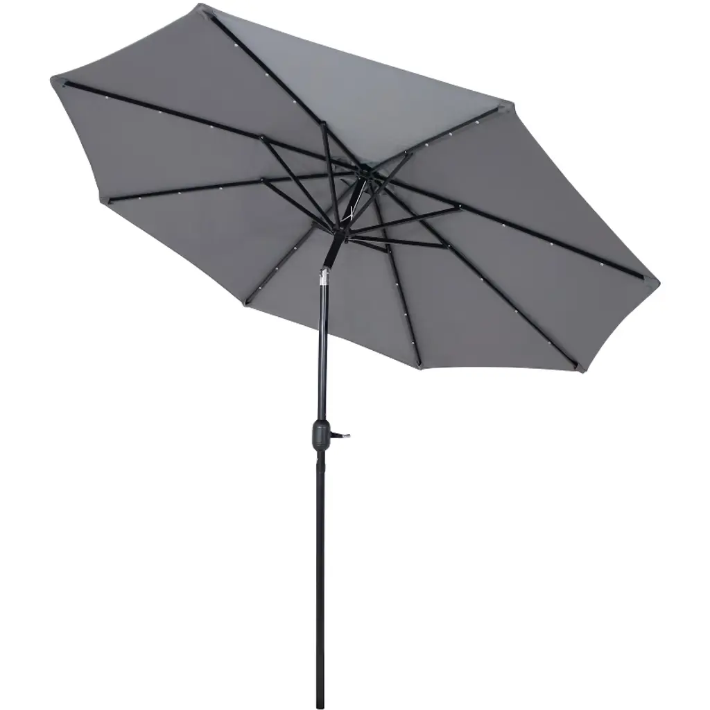 This solar patio umbrella has everything needed to enjoy time outdoors and out of the sun. The tilt and crank functionality can conveniently position the umbrella at just the right angle and makes it easy to close and open it. The umbrella features a solar panel that powers the 24 LED lights located on the steel ribs, making socializing or relaxing under the umbrella day or night enjoyable. The lights operate via a switch on the upper crank housing. When fully charged via solar power, the lights will last 8-10 hours. The large 9' umbrella diameter makes it a great size for any 42"-54" outdoor dining table and chairs. With a standard 1.5" diameter pole, use the patio table umbrella with solar lights with any standard umbrella base (not included) and dining set (not included). In addition, the umbrella is engineered to last with a black, powder-coated aluminum pole for resistance to rust, steel ribs for maximum support, and 100% polyester fabric for the umbrella for extra durability.• PROVIDES OPTIMAL SHADE: This outdoor table umbrella with solar lights measures 9' in diameter x 8' H overall and weighs 8 lbs. The umbrella can easily shade 42"-54" patio tables. The pole crank is 43" H from the ground. This patio umbrella will fit most standard bases (not included) with a 1.5" diameter pole.• DURABLE DESIGN: The outdoor patio umbrella with lights is designed for weather resistance and lasting use. The umbrella is made with a 100% polyester fabric canopy, 8 powder-coated steel ribs, and a powder-coated aluminum pole. The steel ribs provide long-lasting stability to the canopy.• PRACTICAL SHADE ADJUSTMENT: The patio market umbrella features a push-button tilt to adjust the canopy's angle throughout the day. Use the crank to smoothly open and close the canopy. Secure the canopy closed with the attached fabric ties. A vent in the canopy allows for cool air circulation, reduces wind pressure, and increases stability.• SOLAR-POWERED ILLUMINATION: The solar patio umbrella features 3 solar-powered white LED lights on each rib to create a warm, inviting atmosphere without the need for extra wiring. The LED lights feature a 12,000 mcd brightness with a Kelvin color temperature of approximately 3000K. When fully charged, the LED lights can last 6-8 hours. Use the switch on the pole to turn the lights on and off.• WORRY-FREE PURCHASING: Sunnydaze Decor backs its products with a 1-year manufacturer's warranty.