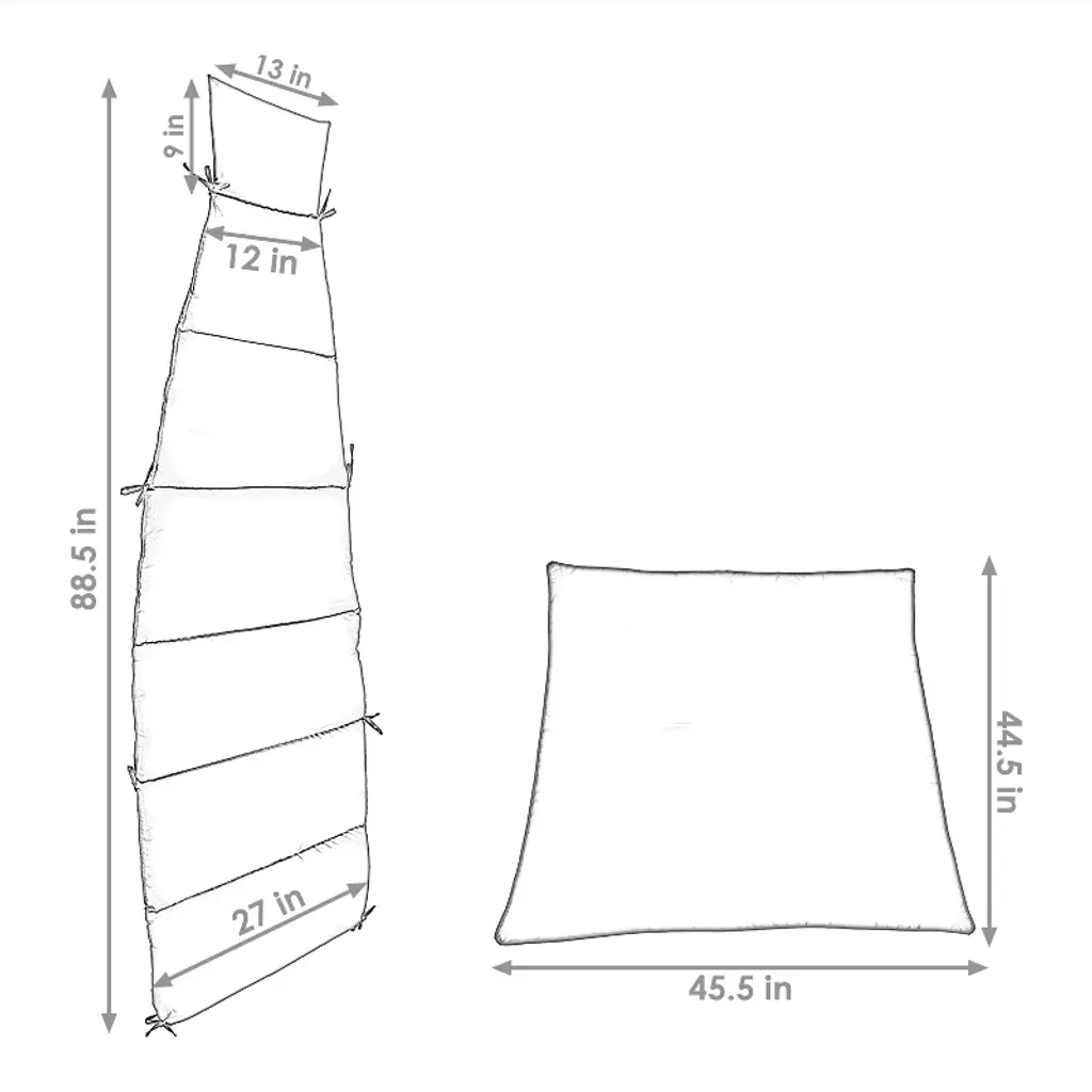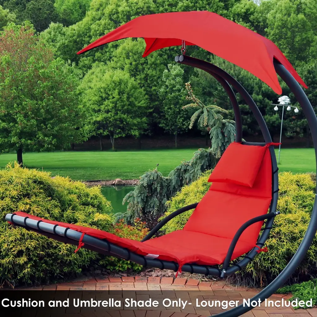 Give an old hanging lounge chair new life with this hanging chair cushion replacement and umbrella cover set. The cushion and umbrella fabric is resilient to withstand the outdoor elements and are easy to clean and maintain. The hanging chair cushion provides a comfortable place to lounge and relax on a hanging lounge chair frame. The umbrella cover is designed to be used with hanging lounge canopies that have a 4-spoke umbrella, as it has four places for the spokes to stay in place in each corner of the fabric. This set is great for replacing an old, worn cushion or simply switching up the colors for a change. Available in many colors, there are options to give any outdoor patio a nice, bright pop of color, bring a complementary color to the existing decor aesthetic, or simply replace an old but loved cushion set.• UPDATE AN OLD CUSHION AND UMBRELLA: The hanging chaise lounge chair outdoor cushion measures 88.5" W (or 79" W with attached headrest pillow folded over) x 27" D x 2" thick and weighs 2.4 lbs. The umbrella measures 44.5" W x 45.5" D and weighs 0.6 lbs.• BEAUTIFUL COLORS AND DURABLE MATERIAL: The hanging lounge chair cushion cover and umbrella are made of a strong polyester fabric that can easily withstand the outdoors and is easy to clean. The hammock chair cushion also features a comfortable polypropylene fiber fill that provides a cozy place to lie back and relax.• SECURE DESIGN: This set includes 1 replacement cushion for outdoor swing lounger and 1 replacement umbrella cover. The cushion features fabric ties that easily attach to the chair frame to stay in place.• RELAX IN THE SHADE: The replacement umbrella is designed for hanging lounge canopies with an umbrella that has 4 spokes.• WORRY-FREE PURCHASING: Sunnydaze Decor backs its products with a 1-year manufacturer's warranty.