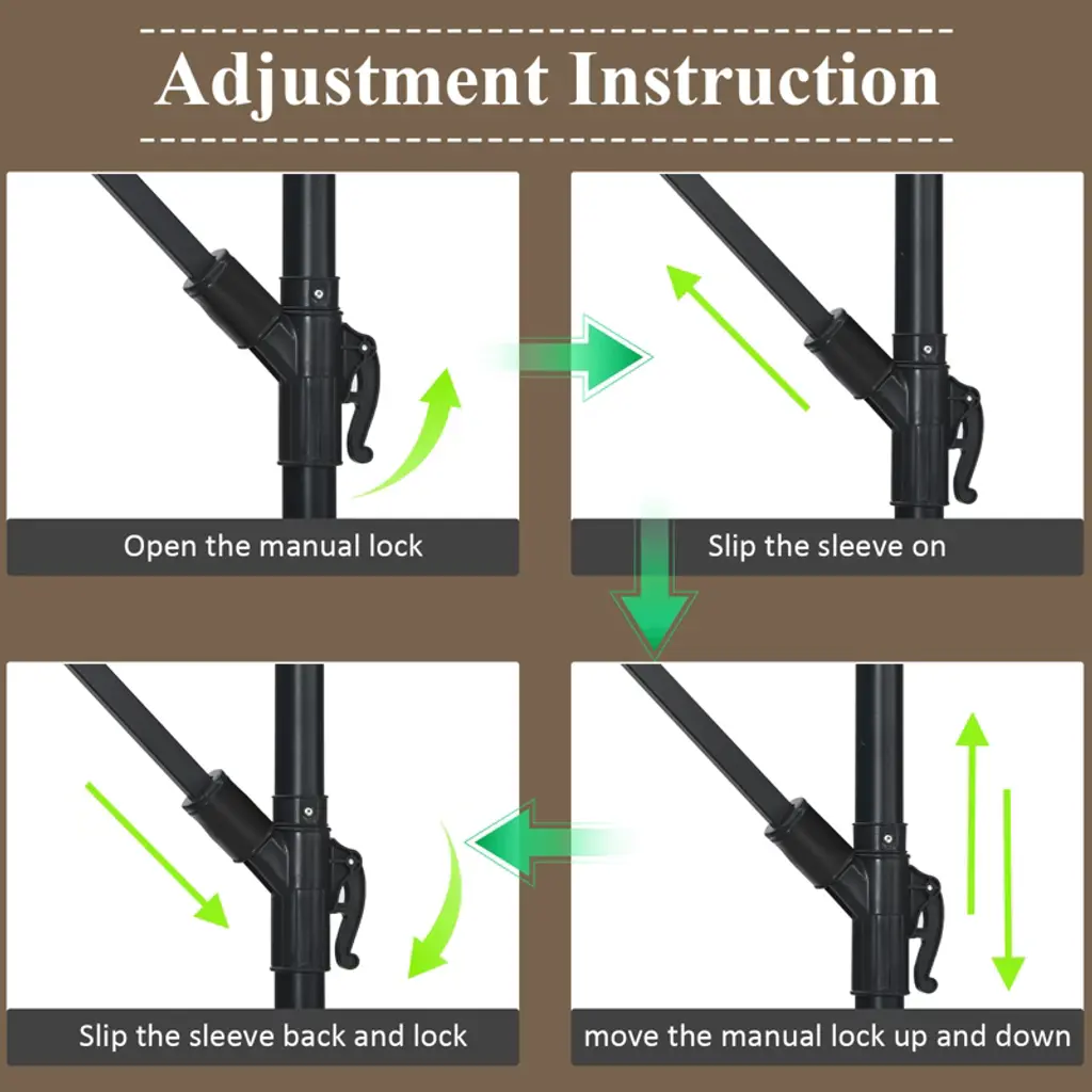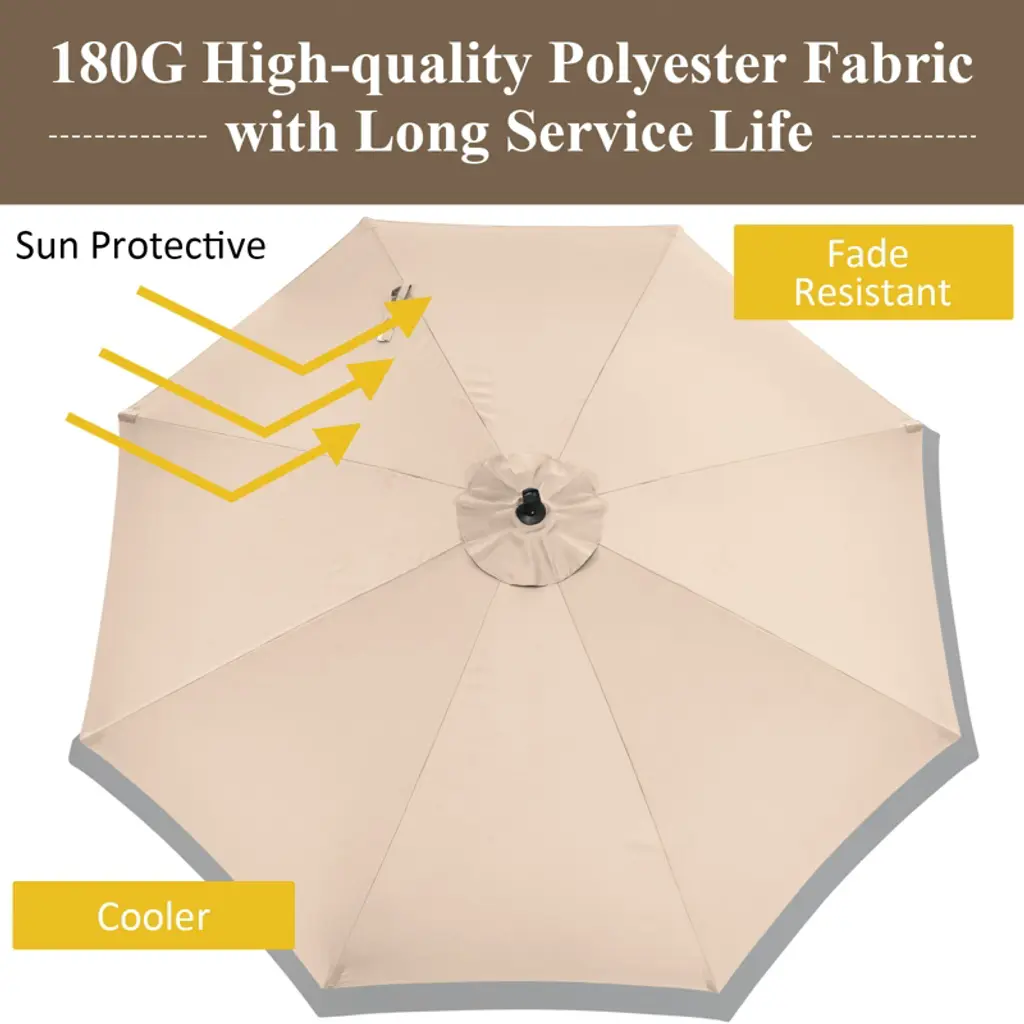 Fancy recommending such an amazing patio umbrella to you! This patio umbrella will be a reliable friend in your leisure time as there are 8 ribs equipped on the canopy with great support while its frame is made of super sturdy and durable steel. With the tilt control system equipped, this umbrella allows you to adjust the angle and enjoy more shading area for the best experience. The crank also offers you great convenience to easily open and close the umbrella according to your need. Moreover, it will be really convenient for you to adjust the height of this umbrella due to its easy adjustment mechanism. Its premium polyester surface which is water repellent and fade resistant can cope with bad weathers and provide you with a peaceful condition.FeaturesCanopy made of high quality material is both water repellent and fade resistant8 steel ribs provides great sturdinessA crank for easy opening and closing the umbrellaTilt control system offers you with great convenience to adjust the height and the angleWidely applicable in backyard, poolside, lawn and parkEasy to assemble according to the detailed instructions includedA cross base is included and a weighted base (not include) is needed to keep our umbrella stableColor: Gray/Red/Orange/Beige/Coffee/Navy Material: Iron, Polyester Fabric Overall Dimension: 10’ x 8’/ 300cm x 237cm (Dia x H) Cross Base Dimension: 39.5” x 39.5”/ 100cm x 100cm Rib Number: 8 Net Weight: 26lbs Package includes: 1 x Patio Umbrella 1 x User Guide