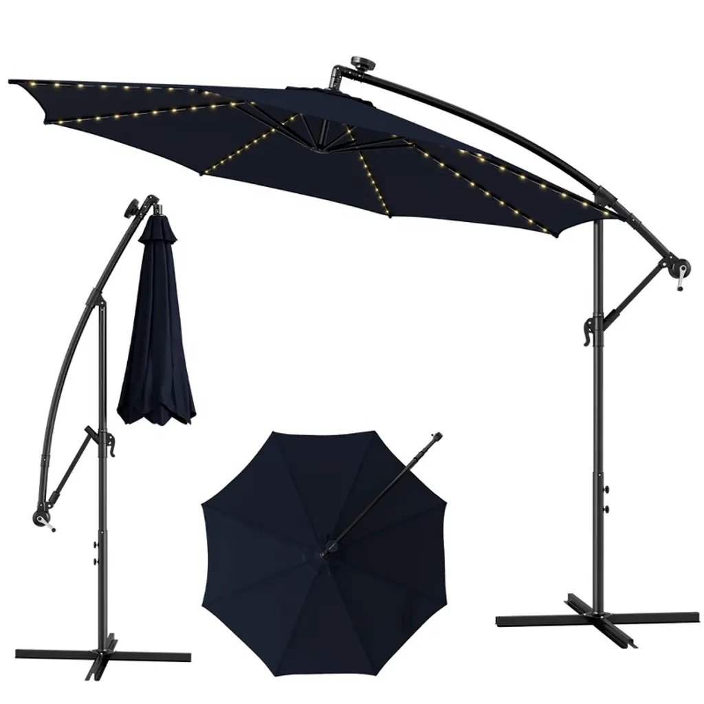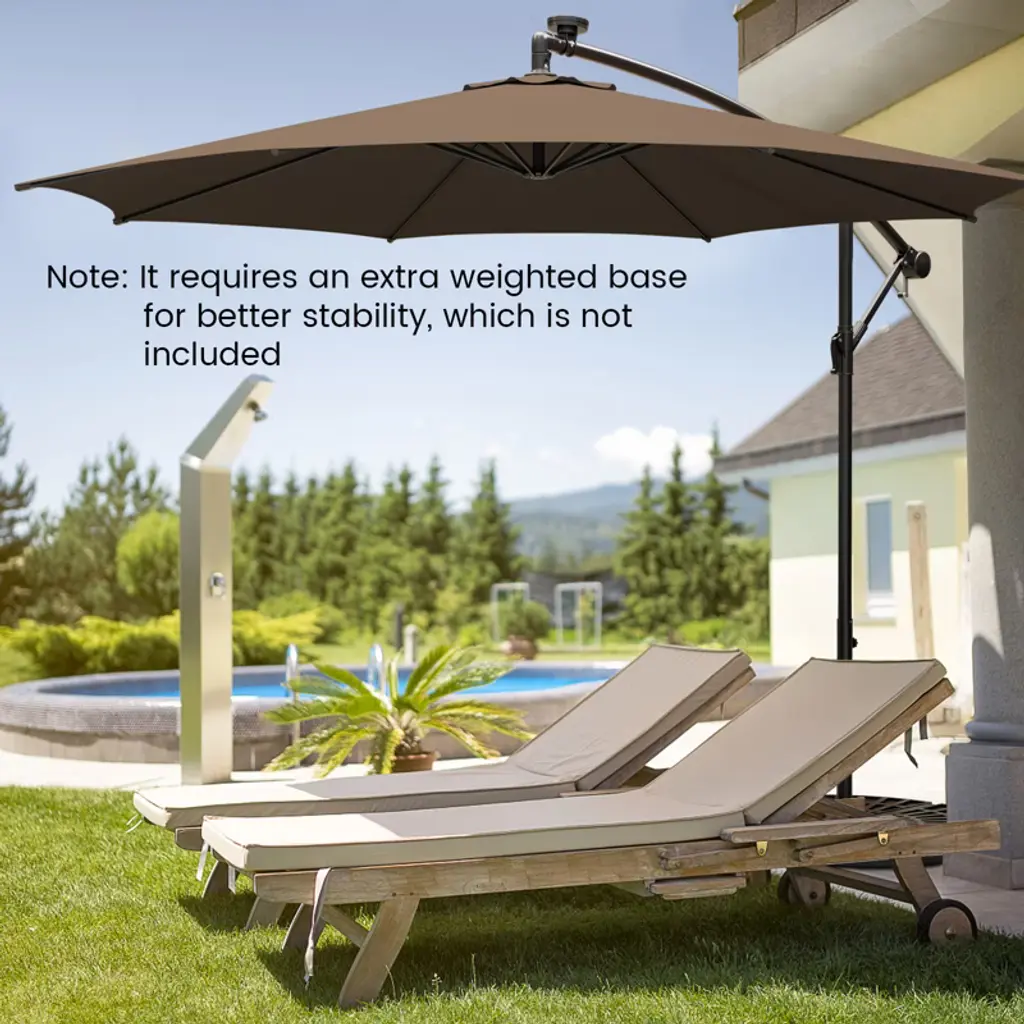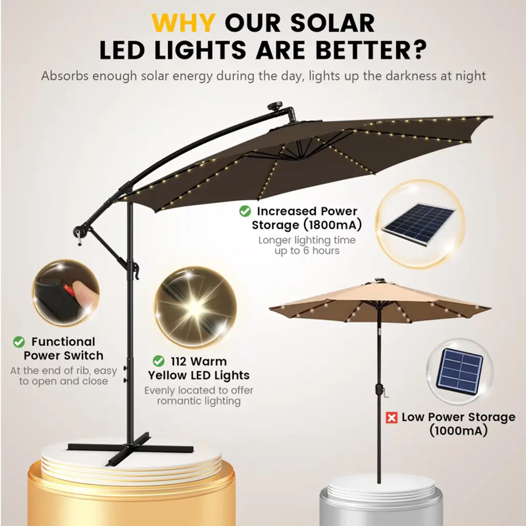 Let the solar offset umbrella light the darkness! The cantilever umbrella has a strong solar panel (1800mA), so up to 112 warm yellow LED lights could illuminate for 6 hours. More, the top canopy contains 2 tiers, making air circulation smoother and dispelling more heat. Since it’s made of 180g polyester, the umbrella is sun-proof and drizzle-proof. However, don’t use it in extreme weathers. Supported by a thick pole and 8 metal ribs, the patio umbrella could stably stand outdoors and offer a large sun shade up to 80 sq.ft. For better stability, you should add an extra weighted base (not included). Thanks to a scientific tilting system, the offset umbrella is easy to open and the canopy can be adjusted back & forth. Finally, the folded umbrella measures 3.3ft x 3.3ft x 8ft (L x W x H), convenient for storage.Features10ft patio offset umbrella with sun protection, drizzle resistance, tear resistance and fade resistance180g polyester fabric with great durability ideal for diverse outdoor events112 warm yellow LED lights evenly located to offer romantic lightingEach LED light absorbs enough solar energy during the day, lights up the darkness at nightIncreased power storage (1800mA) for longer lighting time up to 6 hours, better than others with low power storage (1000mA)Functional power switch at the end of rib, easy to open and closeEasy setup & scientific tilt system, saves you a lot of time and effortSpecifications: Color: Beige/Coffee/Navy/Red Material: Polyester Fabric, Metal Diameter of Canopy: 10ft Overall Height: 8ft Entrance Height of Canopy: 6.9ft/ Length of Lower Part: 2.5ft Folded Size: 3.3ft x 3.3ft x 8ft(W x D x H) Net Weight: 29.5lbs Package Includes: 1 x Offset Umbrella 1 x User Guide