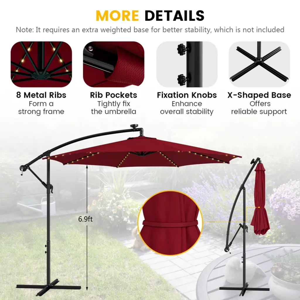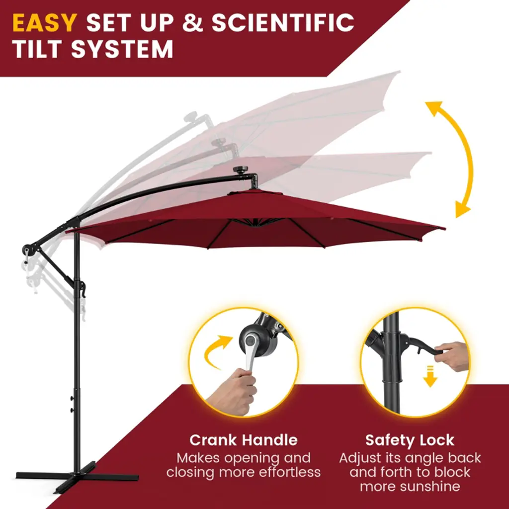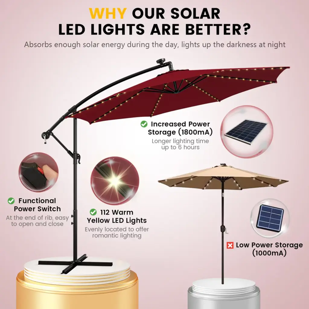 Tangkula 10ft Solar Offset Umbrella Tilted Cantilever Hanging Umbrella With 112 Led Lights Patio Sun Shade With Crank Handle Wine
