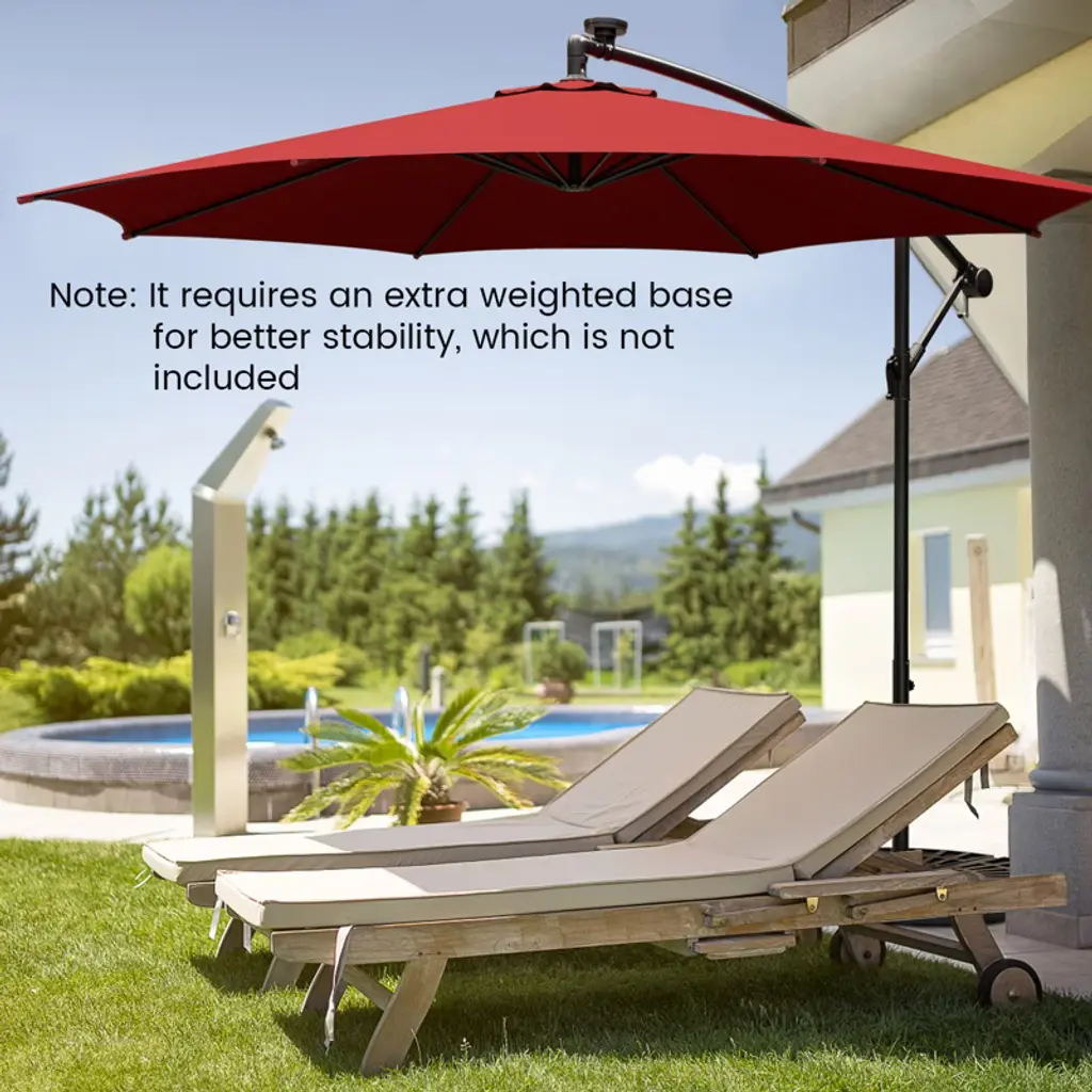 Let the solar offset umbrella light the darkness! The cantilever umbrella has a strong solar panel (1800mA), so up to 112 warm yellow LED lights could illuminate for 6 hours. More, the top canopy contains 2 tiers, making air circulation smoother and dispelling more heat. Since it’s made of 180g polyester, the umbrella is sun-proof and drizzle-proof. However, don’t use it in extreme weathers. Supported by a thick pole and 8 metal ribs, the patio umbrella could stably stand outdoors and offer a large sun shade up to 80 sq.ft. For better stability, you should add an extra weighted base (not included). Thanks to a scientific tilting system, the offset umbrella is easy to open and the canopy can be adjusted back & forth. Finally, the folded umbrella measures 3.3ft x 3.3ft x 8ft (L x W x H), convenient for storage.Features10ft patio offset umbrella with sun protection, drizzle resistance, tear resistance and fade resistance180g polyester fabric with great durability ideal for diverse outdoor events112 warm yellow LED lights evenly located to offer romantic lightingEach LED light absorbs enough solar energy during the day, lights up the darkness at nightIncreased power storage (1800mA) for longer lighting time up to 6 hours, better than others with low power storage (1000mA)Functional power switch at the end of rib, easy to open and closeEasy setup & scientific tilt system, saves you a lot of time and effortSpecifications: Color: Beige/Coffee/Navy/Red Material: Polyester Fabric, Metal Diameter of Canopy: 10ft Overall Height: 8ft Entrance Height of Canopy: 6.9ft/ Length of Lower Part: 2.5ft Folded Size: 3.3ft x 3.3ft x 8ft(W x D x H) Net Weight: 29.5lbs Package Includes: 1 x Offset Umbrella 1 x User Guide