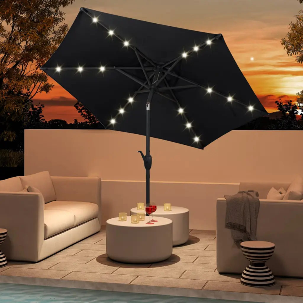 Great solar umbrella for your summer time! The table umbrella is fitted with a powerful solar panel, which could store 1800mA power and allow 112 LED lights to light up the darkness for 6 hours. More, the 10ft umbrella has a 2-tier canopy that offers 80 sq.ft sunshade. Plus, it’s made of 180g polyester and also UV-proof, drizzle-proof & tear-proof. With a crank lifting handle, the market umbrella could be easily opened and closed. As needed, push button tilt system offers 60° angle adjustment to block more sunshine. Finally, there are some essential info you need to know. The diameter of pole is 1.48” that fits most tables. Do not use the umbrella in extreme weathers and it needs an extra weighted base (not included) for better stability.FeaturesSolar panel absorbs energy in the daytime and ensures 1800mA power storage112 preinstalled LED lights need 6-hour charging for 6-hour lightingMade of 180g polyester fabric which shows UV protection and drizzle resistanceWith tear resistance for better durability, and not easy to fade, keep a look like newCustomized angle between 60°, adapts to changes in light direction, blocks more sunlightCrank lifting handle effortless to open and close2-tier top for good ventilation on hot summer daysSpecifications: Color: Beige/Coffee/Navy/Red Material: Polyester Fabric, Metal Overall Dimension: 10ft x 10ft x 8.5ft(W x D x H) Length of Lower Part: 3.5ft Entrance Height of Canopy: 7ft Diameter of Pole: 1.48” Net Weight: 17.5lbs Package Includes: 1 x Solar Patio Umbrella 1 x User Guide