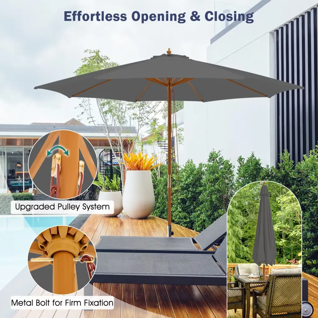 Tangkula 10ft Wooden Market Table Umbrella Pulley Sunshade Canopy W/8 Bamboo Ribs Gray