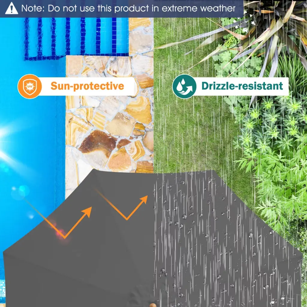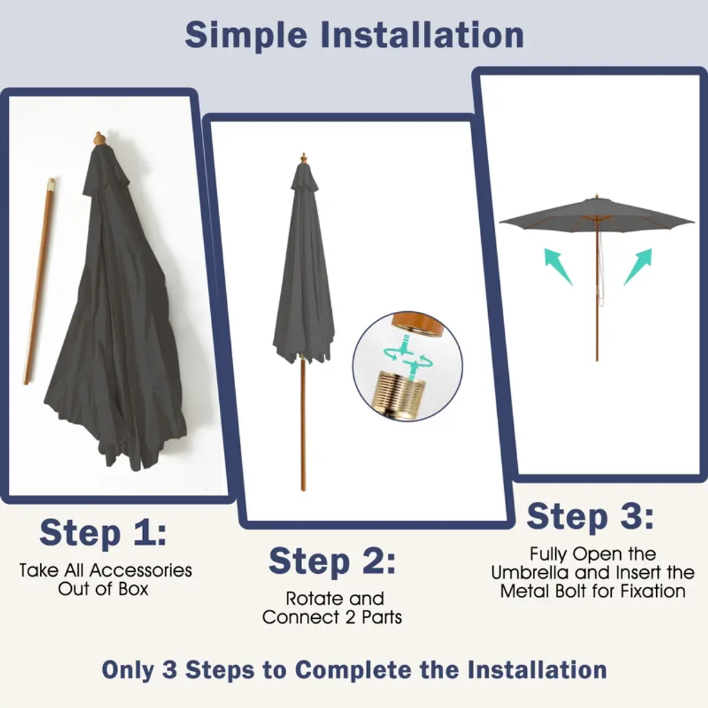 Enhance your outdoor experience with our wooden patio umbrella! Perfect for outdoor parties, picnics, or barbecues, our 10ft wooden umbrella provides spacious shading in courtyards, patios, and gardens. The umbrella, crafted from 180g polyester, is breathable, fade-resistant, and waterproof, ensuring durability. Ventilation in the roof promotes air circulation and stability, while 8 sturdy bamboo ribs offer strong support. The wooden poles add robustness while maintaining a natural appearance, and are removable for easy installation and storage. The rope pulley system allows for effortless opening and closing, and the umbrella pole has 3 adjustable height levels for customized shade.FeaturesSpacious shade area accommodates various outdoor activities Vented roof enhances stability and air circulation Easy-to-use rope pulley for quick opening and closingSpecifications:Color: Gray / Navy / Red Material: 180G Polyester Fabric, PP, Bamboo, Wood Dimensions: 10' x 10' x 8.6'(L x W x H) Rope Length: 5.2' Net Weight: 13 lbs Package includes: 1 x Wood Patio Umbrella 1 x Instruction