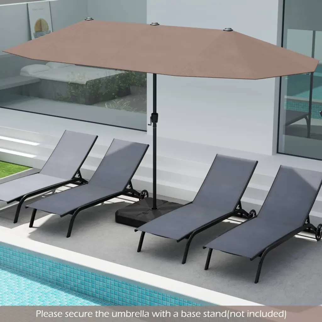 Create your personal shaded retreat with the twin size patio umbrella. The double-side patio umbrella is designed to provide extensive shading coverage, making it perfect for a wide range of settings, such as backyard, poolside, deck. Crafted with a high-quality polyester canopy, the extra large outdoor umbrella ensures effective sun protection and long-lasting performance. Moreover, the oversized umbrella comes with 20% thicker ribs, which boasts 5+2+5 sturdy frame for a reliable structure. Additionally, the 13 ft garden umbrella features a convenient 2-section design and a user-friendly crank handle, making assembly and storage a breeze. Note: Please secure the umbrella with a base stand(not included).FeaturesDouble-sided patio umbrella offers extended shading area Equipped with a solar panel for energy-saving illumination 108 light beads and light switch allow you to enjoy bright illumination with easeSpecifications:Color: Beige / Coffee / Grey / Navy / Orange / Red Material: Polyester Fabric, Metal Product Dimensions: 13 x 7 x 7.3 ft (L x W x H) Ground Clearance: 6 ft Net Weight: 18.5 lbs Package Includes: 1 x Double-Sided Patio Umbrella 1 x User's Manual