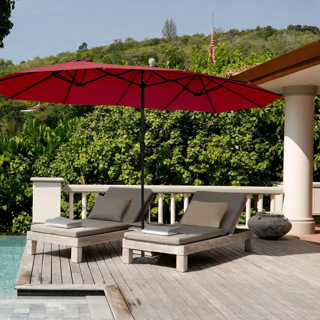Our beautiful patio umbrella can create more shade in summer, which enables you to enjoy excellent outdoor relaxing time. Made of solid and long-lasting iron parts, this outdoor offset umbrella can adapt to the harsh outdoor climate. Canopy which made of long-lasting polyester fabrics is waterproof and UV resistant. You can easily use the crank to turn it on or off which is not only labor-saving but also safe. It's perfect for gardens, balconies, decks, swimming pools or cafes.FeaturesDouble-Sided Canopy Provide large shade area Vents are designed to allow air flow and reduce wind pressure Comes with a rocker to open and close the umbrella easier Metal frame ensures stability and durability Folding design for easy storage and move Polyester cloth does well in protecting against rain and ultraviolet radiation. Simple assembly is required Widely used in garden, hotel, market, saloon, by pool side or on the beachSpecifications Material: Steel + 180g polyester fabric Color: Red Overall Dimension: 15'x 8.5'x 8'(L x W x H) Diameter of umbrella pole: 48mm Package includes: 1 X Patio double -side umbrella No include umbrella base 1 x Instructions