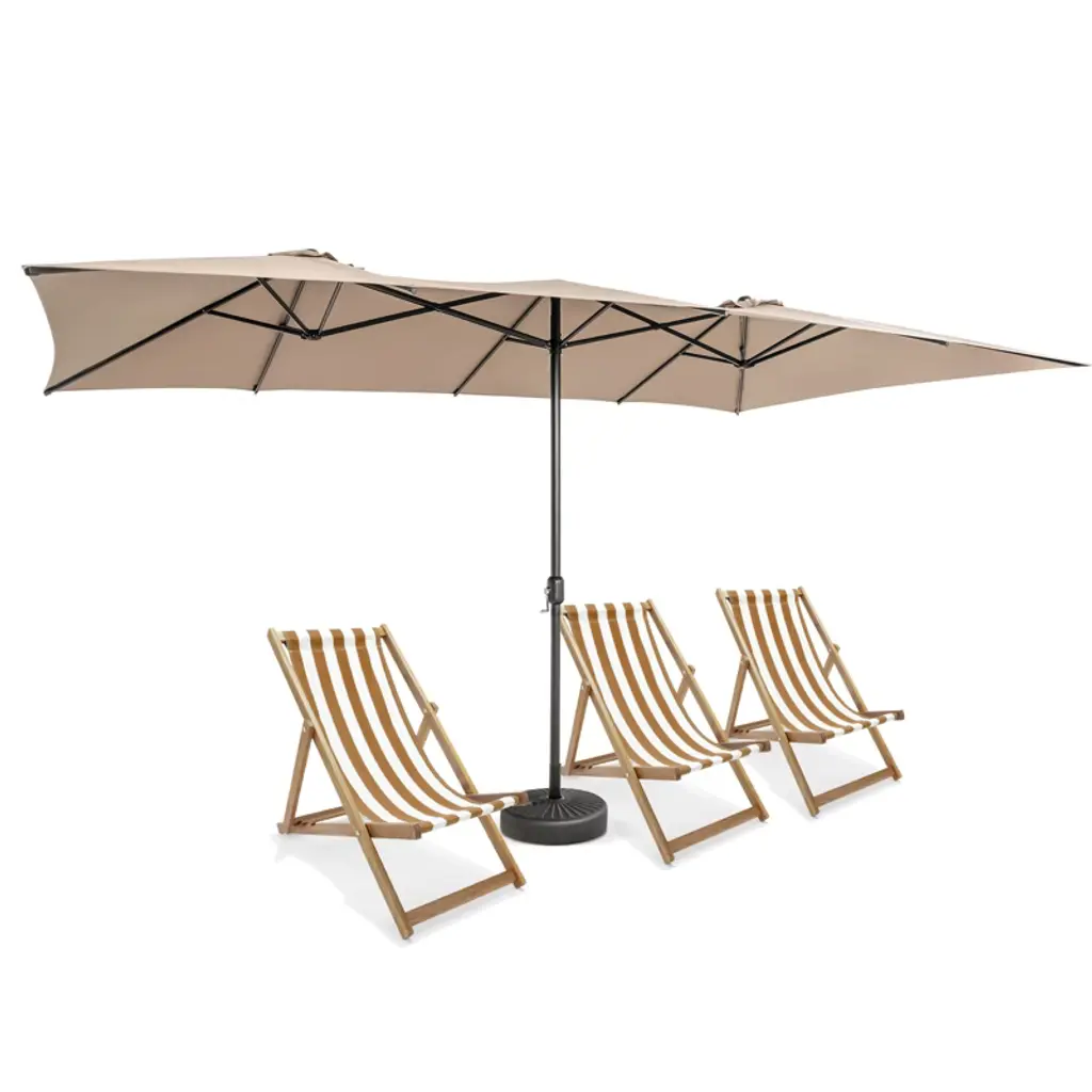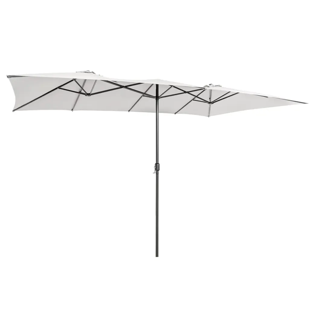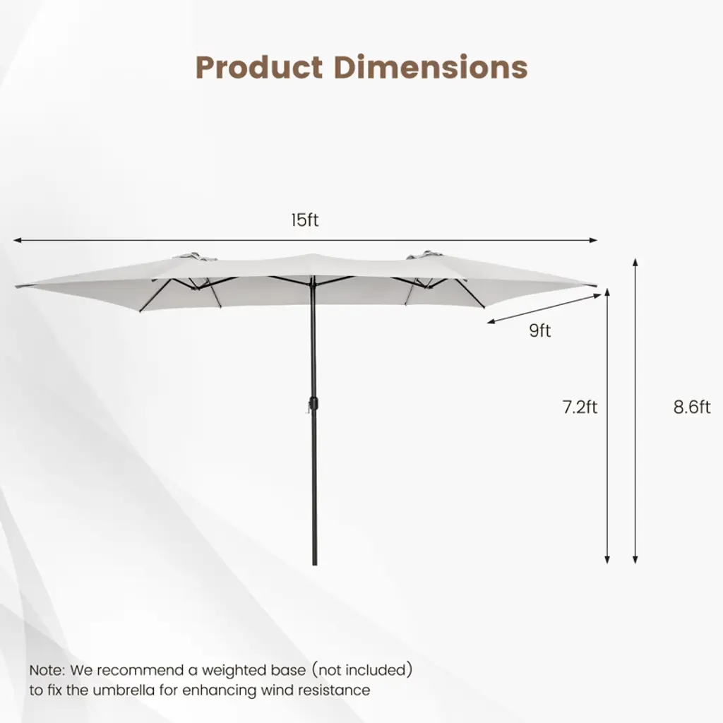 Our expansive 15 ft dual-sided patio umbrella provides ample coverage for a furniture set, allowing you to savor leisurely moments with friends or family in your splendid garden, patio, or terrace. It is also ideal for lounging by the poolside or seaside. Thanks to the user-friendly crank handle, you can effortlessly open or close the umbrella by rotating the handle. Furthermore, the canopy is crafted from premium polyester fabric with a PA coating, offering excellent resistance to drizzles, sun exposure, and heat, ensuring superior protection during outdoor escapades.FeaturesOffers expansive coverage for you and your outdoor furniture set Equipped with a convenient crank handle for effortless opening, secured by a snap pin Easily detachable into two sections, enabling convenient transport and storageSpecifications:Color: Beige/ Coffee Material: Polyester Fabric, PA Coating, Metal Overall Dimensions: 15 x 9 x 8.6 ft (L x W x H) Ground Clearance: 7.2 ft Diameter of the Pole: 1.9" Net Weight: 27.5 lbs Package Includes: 1 x Double-Sided Patio Umbrella 1 x User's Manual