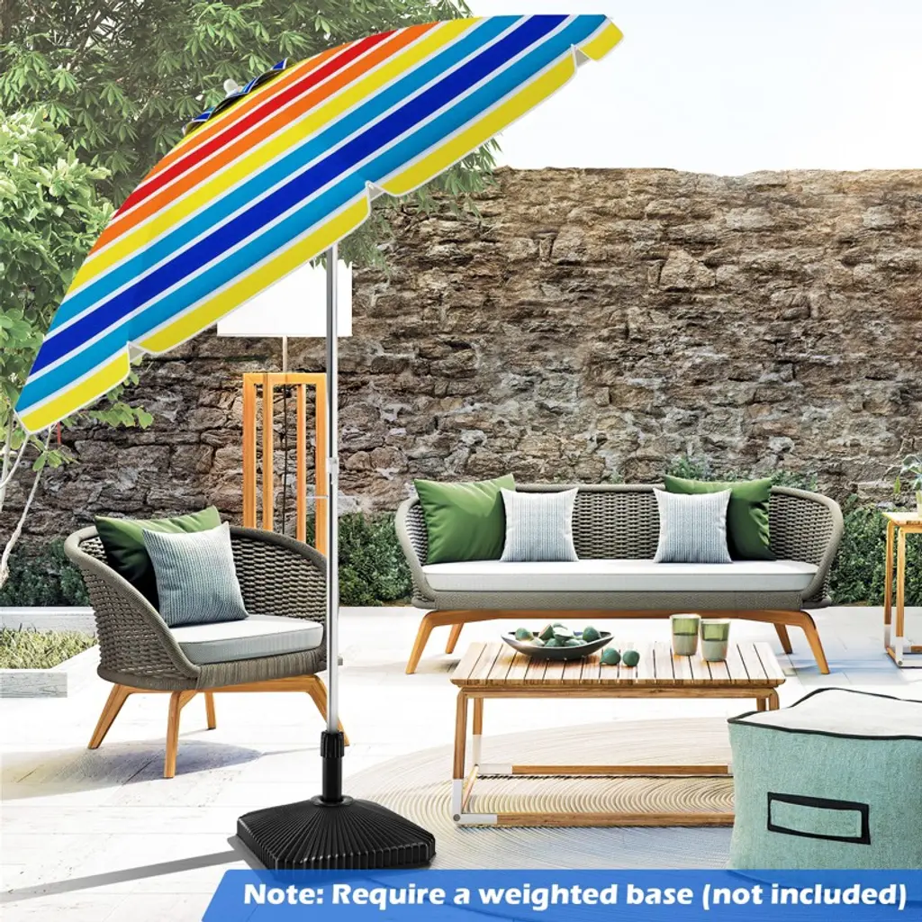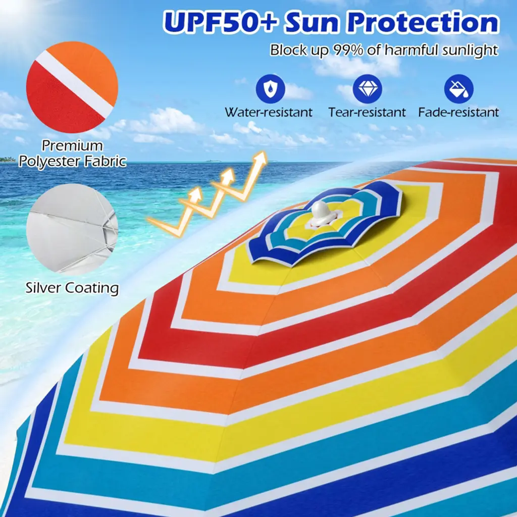 The Ultimate Summertime Companion! Crafted with a premium polyester canopy and silver coating, this 6.5 ft beach umbrella is your barrier against 99% harmful sunlight, providing UPF50+ sun protection, ensuring you can enjoy the sun safely without the risk of sunburn. This is complemented by a convenient push button tilt feature, which allows you to adjust the shade easily as the sun's position changes, giving you all-day protection. Securing the umbrella is also a breeze with an integrated sand anchor and an aluminum bolt, ensuring a firm hold in sandy environments. Its sturdy design is further enhanced by the rustproof aluminum pole and strong fiberglass ribs, making it a reliable shade provider.FeaturesThe canopy with silver coating offers UPF50+ sun protection, block harmful sunlight The premium polyester canopy features good tear and wear resistance, built to last Assembly requiredSpecifications:Color: Colorful Material: Polyester Fabric, Silver Coating, Fiberglass, Aluminum Product Dimensions: 6.5 x 6.8 ft (Dia. x H) Umbrella Rim Height: 5.3 ft Carrying Bag Length: 3.8 ft Net Weight: 3.5 lbs Package Includes: 1 x Beach Umbrella 1 x Carrying Bag