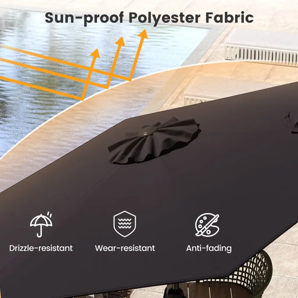 Say goodbye to stuffy outdoor spaces with the patio umbrella! Crafted from high-quality polyester fabric, the outdoor market umbrella is sun-proof and wear-resistant, ensuring long-lasting protection. The vented top design of the patio umbrella allows for increased airflow, creating a cool and pleasant experience. Thanks to the innovative tilt mechanism, the 7.5 ft patio umbrella can optimize shade coverage and protect you from direct sunlight at any time of the day. The crank handle and detachable umbrella pole make assembly and operation a breeze, allowing you to effortlessly set up and enjoy your outdoor oasis in no time.FeaturesSun-proof polyester fabric is wear-resistant and anti-fading Tilt mechanism enables you to customize the shade area according to your preferences Crank handle allows you to effortlessly open and close the umbrellaSpecifications:Color: Beige / Black / Burgundy / Gray / Navy Blue / Tan Material: Metal, Polyester Overall Dimension: 7.5 ft x 7.5 ft x 7.2 ft (L x W x H) Umbrella Rim Height: 6.3 ft Net Weight: 9.5 lbs Package Includes: 1 x Patio Umbrella 1 x User's Manual