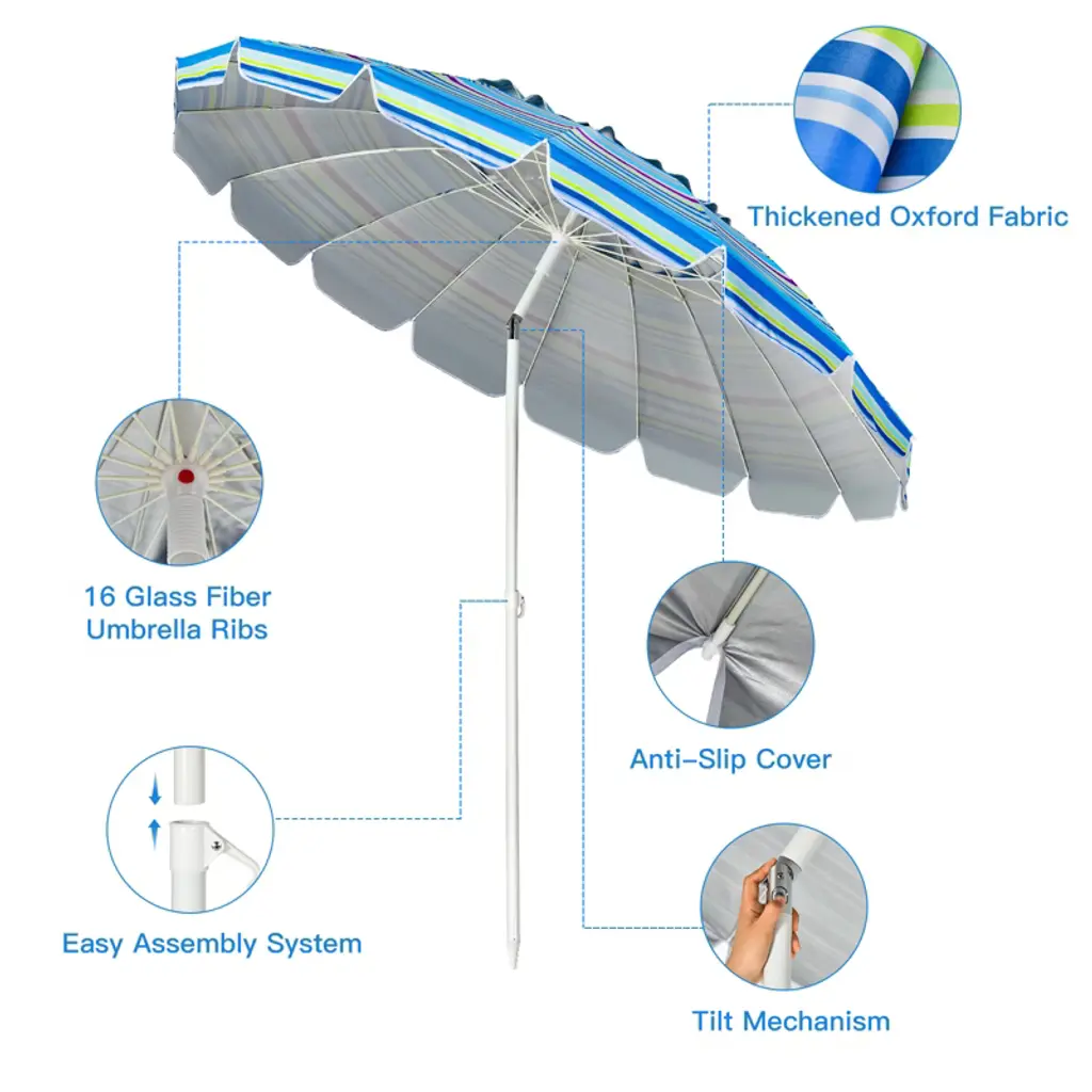 Are you looking for a premium beach umbrella for your beach travel? Our 8 ft beach umbrella is an excellent choice for you to enjoy the natural beach environment and sunshade. The silver coating inside the umbrella provides extra shade protection for you. And the adjustable tilt feature allows you to track the sun easily whole day, so you can quickly adjust the canopy according to your preferences to protect you from the sunlight and sun rays. Made of sturdy structure and high-quality polyester fabric, the outdoor umbrella is durable and sturdy for the constant using. Besides, 16 sturdy ribs and air-vent design on the top can provide excellent sturdily and stability. It's a lightweight beach umbrella with carry bag , so you can fully collapsible for transportation very portable.FeaturesFlexible tilt mechanism can track the sun and maximize your shakeSturdy steel fame and 16 durable ribs provide strong supportSilver-coated polyester fabric provides all-round protection Tile mechanism can be adjusted according to your needsSand anchor ensure its stabilityAir vent on the top for air circulationSuitable for beach, courtyard, poolside, garden and moreSpecifications Color:Navy/Blue/Rainbow Material: Fiberglass +Steel+ Polyester Fabric Overall Dimension:8.0ft(Dia)x8.0ft(H) Net Weight: 6 lbs Number of Ribs: 16 Package includes: 1 x Umbrella 1 x Carrying Bag