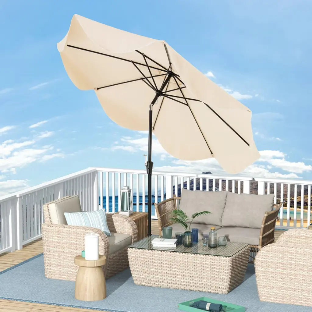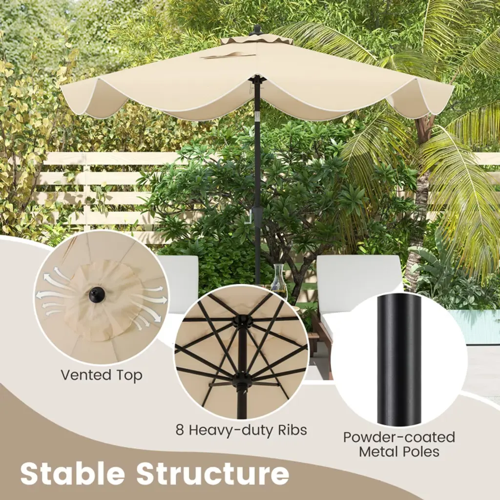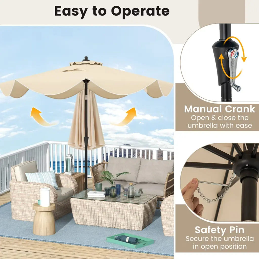 Embrace the beauty of lazy summer days under this patio ruffled umbrella! With 81 sq.ft shade area. the heavy duty patio umbrella offers ample coverage for your outdoor furniture. making it perfect for a variety of activities. Crafted with a wear-resistant polyester canopy. the market umbrella will protect you from harsh sunlight. Thanks to the tilt mechanism. you can conveniently adjust the shade throughout the day. With detachable 2-section pole. the outdoor table umbrella is easy to setup and fold. The crank handle mechanism makes it a breeze to open and close the umbrella. Coming with elegant ruffled edges. the outdoor sunshade umbrella will definitely stand out among traditional patio umbrellas. Additionally. the rib pockets feature hook & loop fasteners to help you fix light strips to increase the vibe.Features25° tilt adjustment can allow you to block out the sunlight from any sides you want Premium polyester canopy is non-fading and sun-proof Anti-rust aluminum push button is long-lasting Vented top promotes heat dissipation and increase stability Powder-coated metal poles and 8 heavy-duty ribs ensure superior stability Manual crank allows you to open & close the umbrella with ease Safety pin will secure the umbrella in open position Stylish ruffled edges will elevate the style of your outdoor settings Rib pockets with hook & loop fasteners allow you to fix the light strip(not included) Screw-in 2-section poles are easy to connect and detach Convenient fixing straps help secure the folded umbrella Applicable to various occasions. including deck. poolside. garden or yardSpecifications: Color: Beige/Navy Material: Polyester Fabric. Metal Product Dimensions: 9 x 8 ft/280 x 245 cm (Dia. x H) Umbrella Ground Clearance(with Ruffles): 6.6 ft/202 cm Net Weight: 12 lbs/5.5 kg Package Includes: 1 x Patio Umbrella 1 x User's Manual