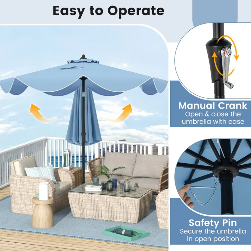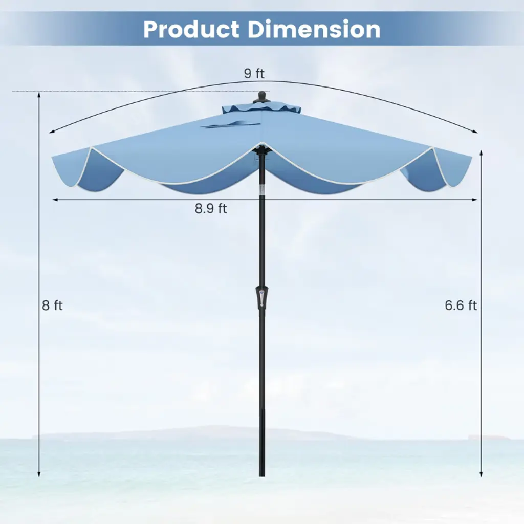 Embrace the beauty of lazy summer days under this patio ruffled umbrella! With 81 sq.ft shade area. the heavy duty patio umbrella offers ample coverage for your outdoor furniture. making it perfect for a variety of activities. Crafted with a wear-resistant polyester canopy. the market umbrella will protect you from harsh sunlight. Thanks to the tilt mechanism. you can conveniently adjust the shade throughout the day. With detachable 2-section pole. the outdoor table umbrella is easy to setup and fold. The crank handle mechanism makes it a breeze to open and close the umbrella. Coming with elegant ruffled edges. the outdoor sunshade umbrella will definitely stand out among traditional patio umbrellas. Additionally. the rib pockets feature hook & loop fasteners to help you fix light strips to increase the vibe.Features25° tilt adjustment can allow you to block out the sunlight from any sides you want Premium polyester canopy is non-fading and sun-proof Anti-rust aluminum push button is long-lasting Vented top promotes heat dissipation and increase stability Powder-coated metal poles and 8 heavy-duty ribs ensure superior stability Manual crank allows you to open & close the umbrella with ease Safety pin will secure the umbrella in open position Stylish ruffled edges will elevate the style of your outdoor settings Rib pockets with hook & loop fasteners allow you to fix the light strip(not included) Screw-in 2-section poles are easy to connect and detach Convenient fixing straps help secure the folded umbrella Applicable to various occasions. including deck. poolside. garden or yardSpecifications: Color: Beige/Navy Material: Polyester Fabric. Metal Product Dimensions: 9 x 8 ft/280 x 245 cm (Dia. x H) Umbrella Ground Clearance(with Ruffles): 6.6 ft/202 cm Net Weight: 12 lbs/5.5 kg Package Includes: 1 x Patio Umbrella 1 x User's Manual