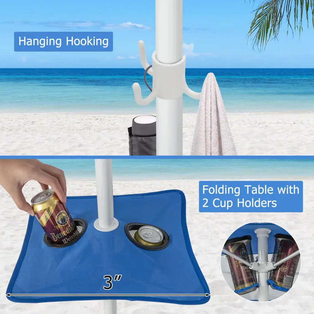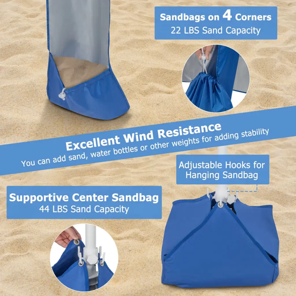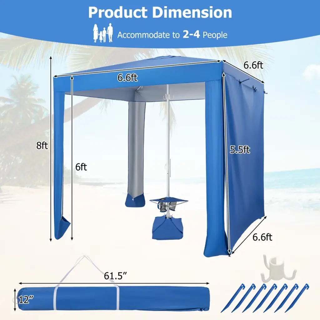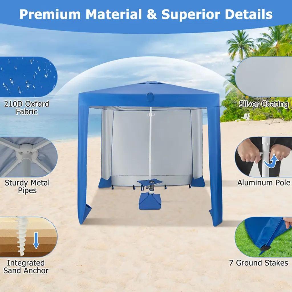 Our beach cabana canopy shelter is a long-lasting and reliable shelter for all your outdoor activities. Our canopy shelter is made of 210D Oxford fabric with silver coating for UPF 50+ sun protection. Engineered with sturdy metal pipes and an aluminum pole, it offers excellent wind resistance. The sandbags on the four corners and middle sandbag can be filled with sand, water bottles, or other weights to add stability. The middle pole with an integrated sand anchor ensures that the umbrella is firmly fixed on the grass or sand, keeping you safe during windy conditions. Enjoy added protection and versatility with the removable sidewall. Featuring a folding table with two cup holders, it gives you the convenience and storage space you need for your cups and belongings. Comes with a storage bag, it can be folded in seconds for easy storage. Experience in our beach cabana canopy shelter for superior sun protection, excellent wind resistance, and convenience in all your outdoor adventures!Features210D Oxford fabric stays safe for UPF 50+ protection Made with high-quality metal pipes and an aluminum pole for reliable useRemovable sidewall can protect your skin from harsh sunlightAccommodate up to 2-4 people with ample space for relaxation and loungingCenter sandbag and 4 corner sandbags can be filled to provide stabilityFolding table with 2 cup holders keeps snacks and beverage within easy reachSpecifications: Color: Blue Material: 210D Oxford Fabric, Silver Coating, Aluminum, Metal, 130G Polyester Overall Dimension: 6.6ft x 6.6ft x 8ft(L X W X H) Sidewall Size: 6.6ft x 5.5ft(L X W) Diameter of the Cup Holder: 3" Table Size: 14.5" x 14.5"(LX W) Carrying Bag Size: 12" x 61.5"(Dia. X H) Net Weight: 9.5 lbs