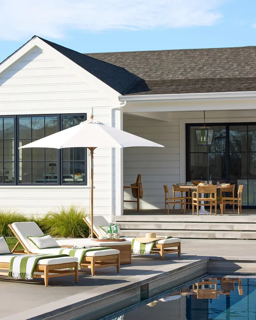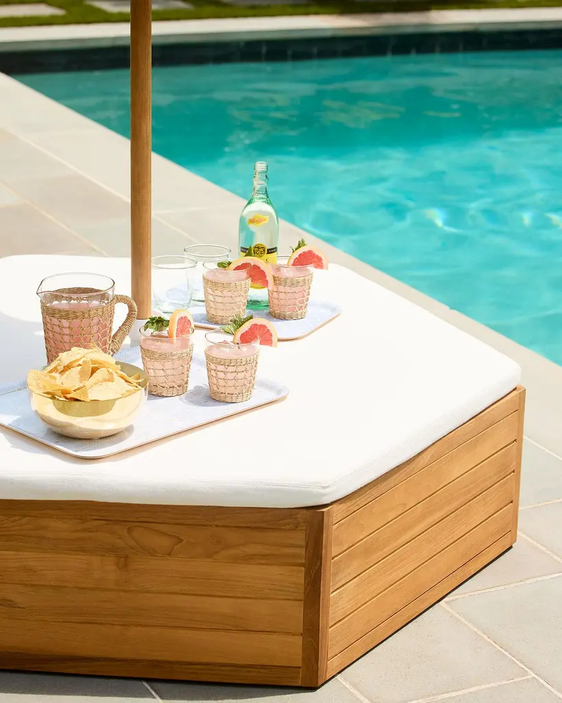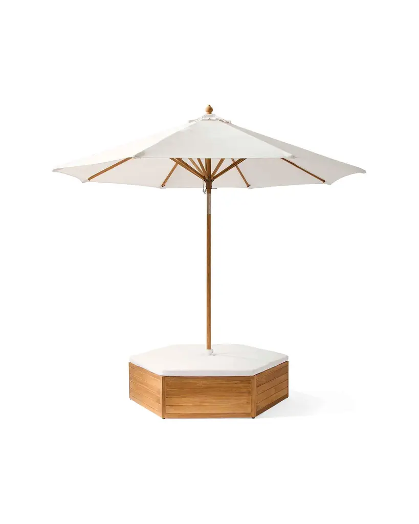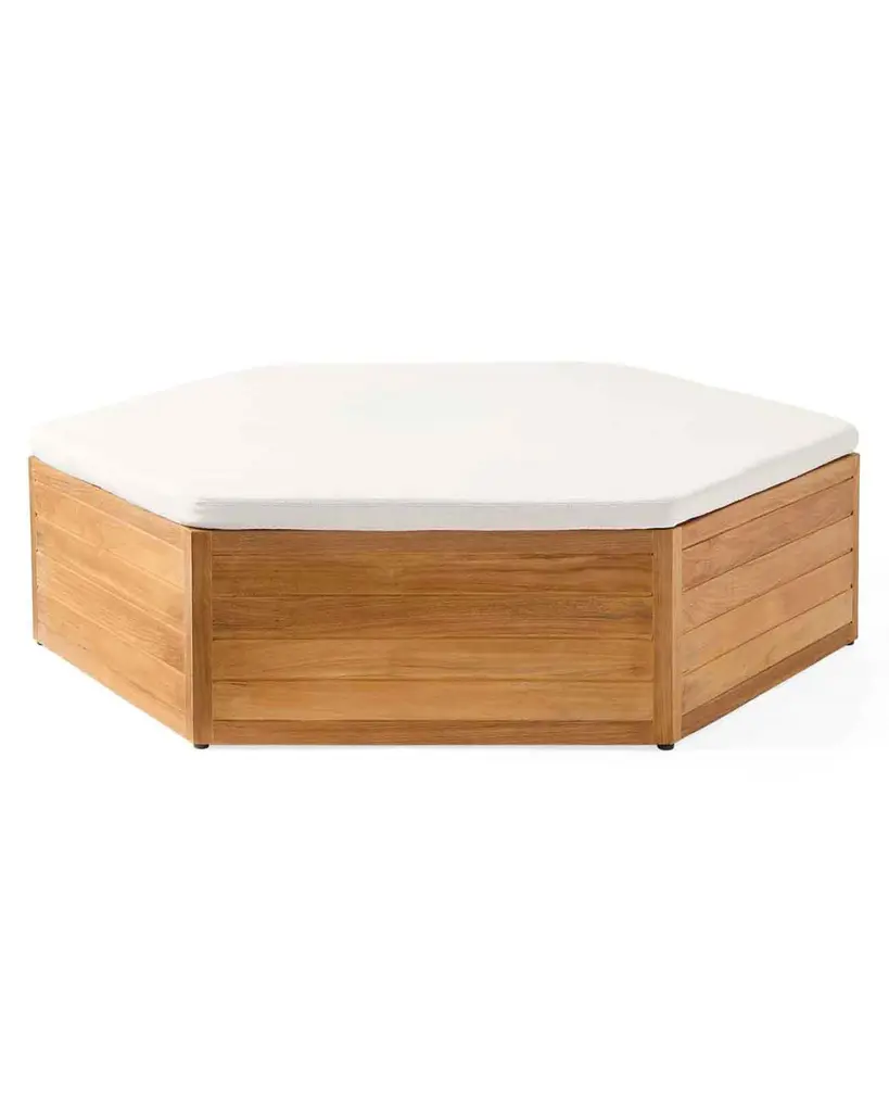 Modern in shape. Sustainably-sourced Grade A Teak serves as a sturdy, hexagon base. Topped with a bounce-back cushion constructed for comfort, support, and longevity. Covered in performance fabric.