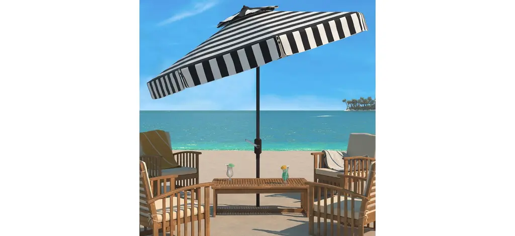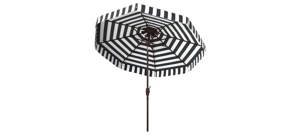 Inspired by the healing waters in a luxurious health spa in Germany's village of Baden Baden, this fashionable eleven foot Torin Round Umbrella is a favorite for those who love a touch of Euro flair. The coastal cool navy and white stripes keep it classic, while its elegant trim gives it a subtle modern update.
