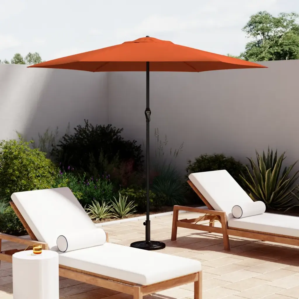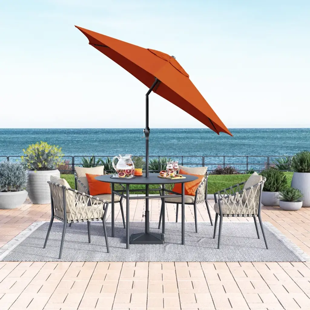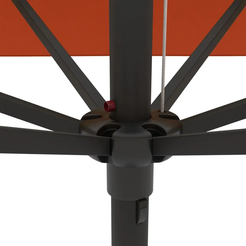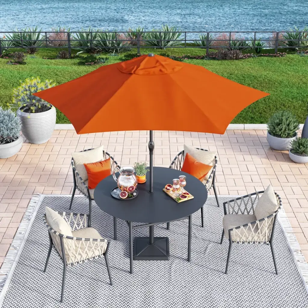Keep your patio dining table or seating group shaded and cool with this 08'' market umbrella. The hexagonal canopy is crafted from water-resistant, UV-resistant, and fade-resistant polyester, offering UPF 30 protection. It features a vented design that allows for air circulation, keeping you cool on those sunny days. The matte black steel pole and ribs offer stability and support, while the crank lift opening mechanism makes it easy to open and close. Plus, it includes a push-button tilt method for easy adjustability, ensuring you'll always have shade where you need it. A stand is not included.