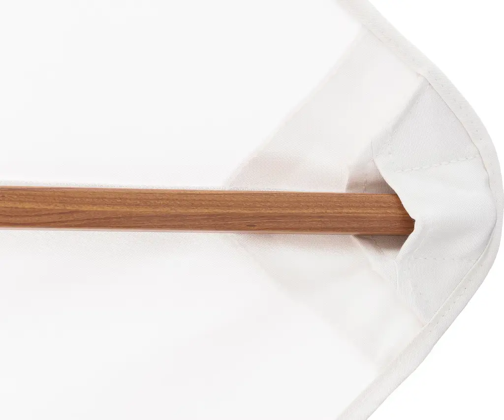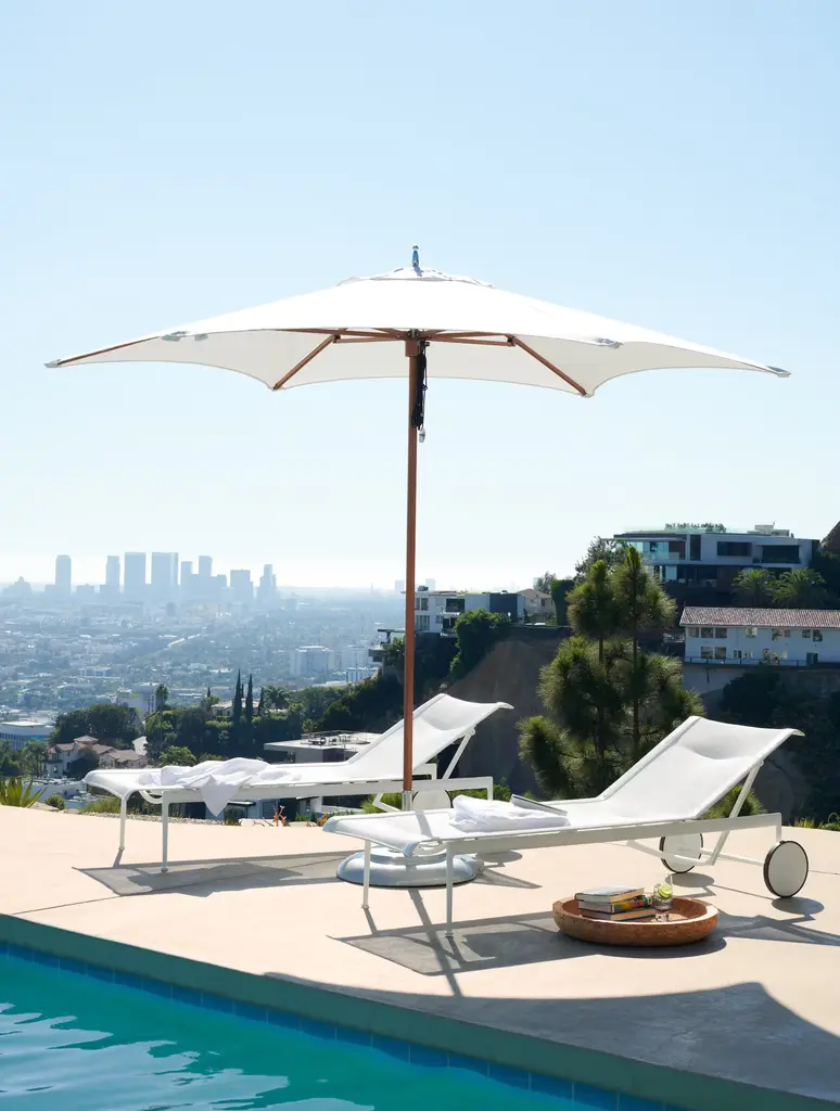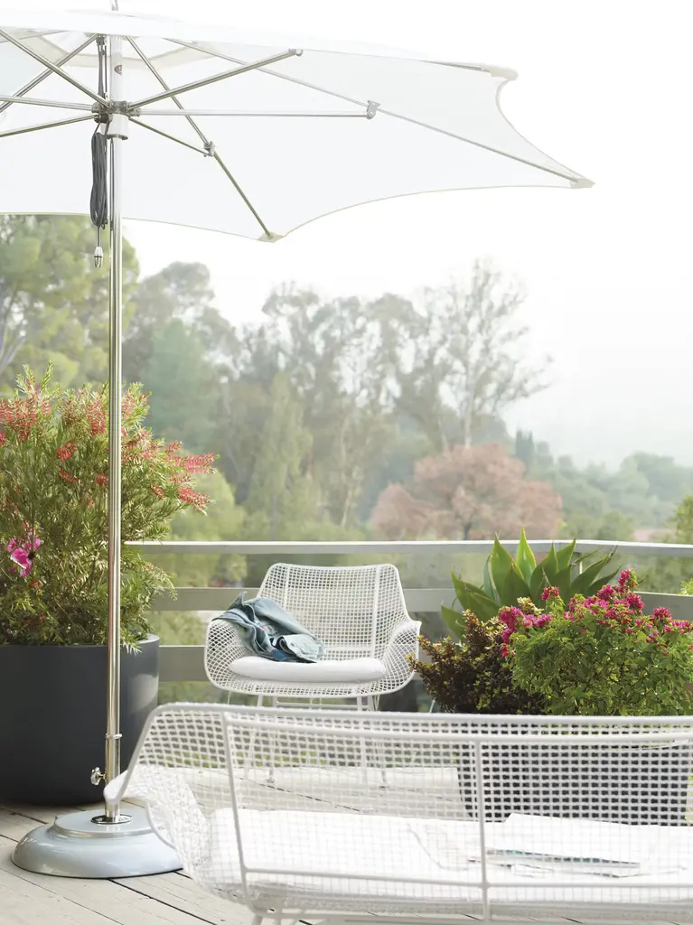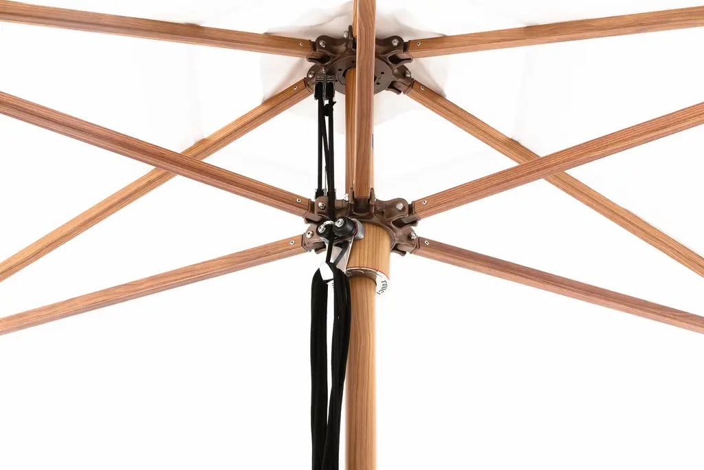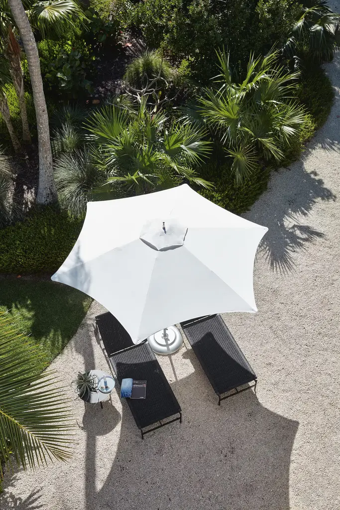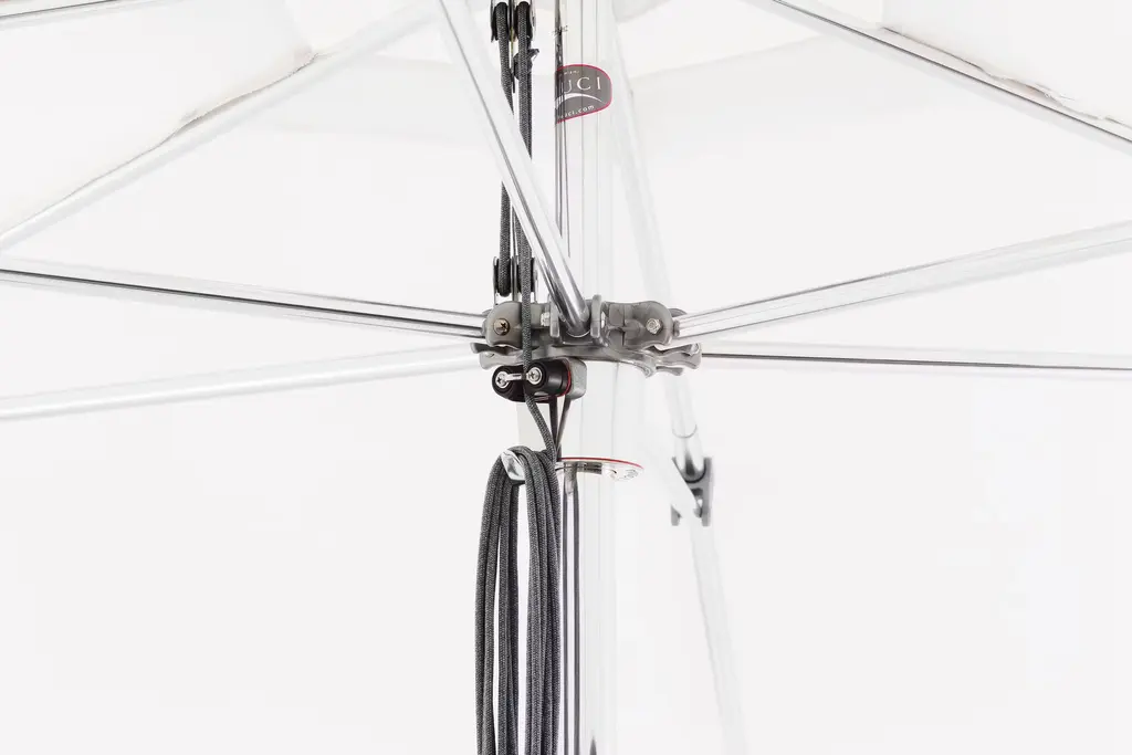 Tuuci Ocean Master Hexagon Umbrella (2000) features a horizontal shade canopy design to accommodate long dining tables. Designer Dougan Clarke, a skilled sailor who is well-versed in sails, rigging, and boat design, knows what will stand up to the elements. He tests Tuuci umbrellas' canopies and engineering in two wind tunnels at their Miami headquarters. Hexagon is easy to use and maintain and is constructed of replaceable marine-grade components to ensure a lifetime of serviceability. Its cam cleat and pulley system lets you raise and lower the shade with ease. As with other shades, keep these in closed position during storms and when not in use. DWR is not responsible for accidents or damage caused by misuse or weather. Please note: Crazing lines may appear on the canopy fabric when it is first installed. Crazing is natural, due to the finishing of the fabric and does not affect the performance or characteristics of Sunbrella or other solution-dyed acrylic fabrics. The fabric remains water repellent as well as stain- and mildew-resistant and the lines will diminish over time with exposure to the elements.