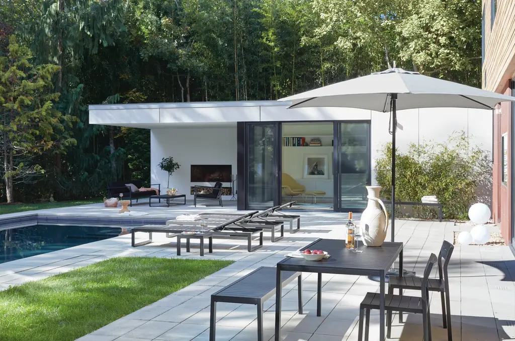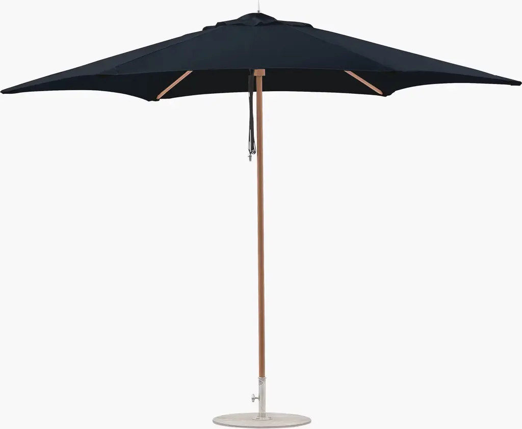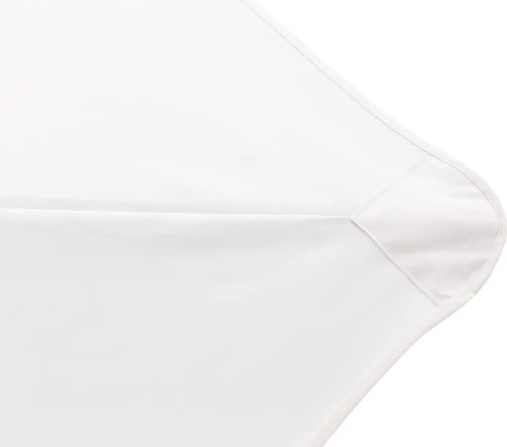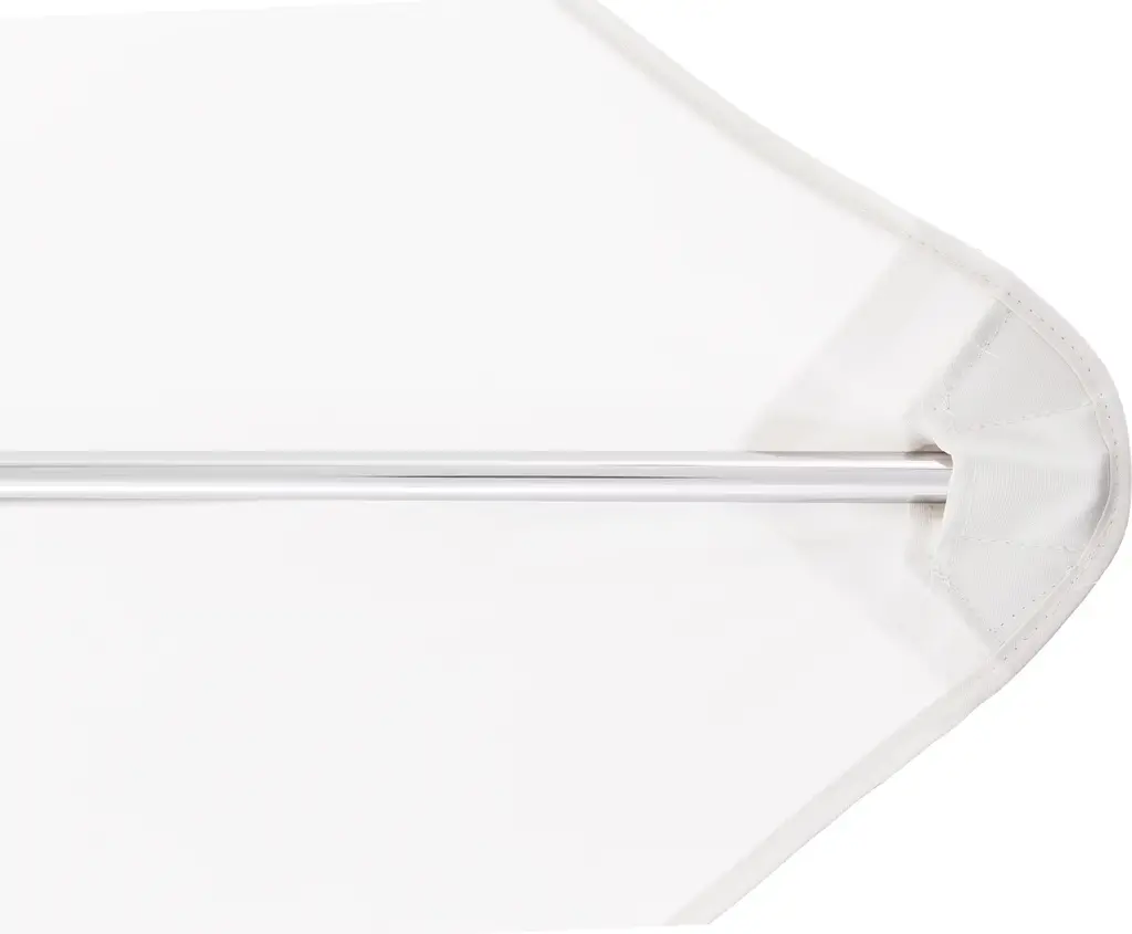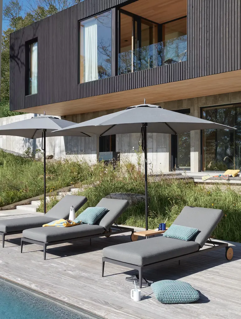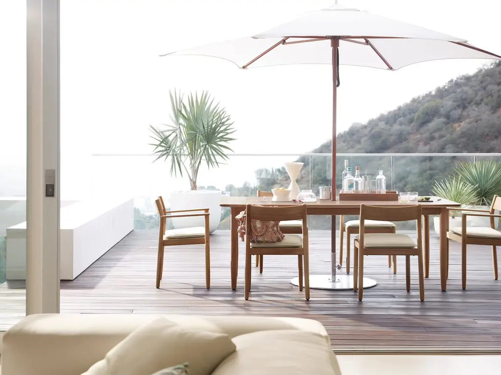 Tuuci Ocean Master Hexagon Umbrella (2000) features a horizontal shade canopy design to accommodate long dining tables. Designer Dougan Clarke, a skilled sailor who is well-versed in sails, rigging, and boat design, knows what will stand up to the elements. He tests Tuuci umbrellas' canopies and engineering in two wind tunnels at their Miami headquarters. Hexagon is easy to use and maintain and is constructed of replaceable marine-grade components to ensure a lifetime of serviceability. Its cam cleat and pulley system lets you raise and lower the shade with ease. As with other shades, keep these in closed position during storms and when not in use. DWR is not responsible for accidents or damage caused by misuse or weather. Please note: Crazing lines may appear on the canopy fabric when it is first installed. Crazing is natural, due to the finishing of the fabric and does not affect the performance or characteristics of Sunbrella or other solution-dyed acrylic fabrics. The fabric remains water repellent as well as stain- and mildew-resistant and the lines will diminish over time with exposure to the elements.