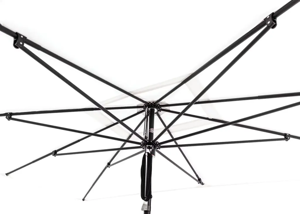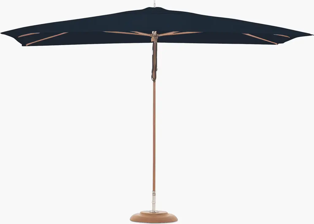 Tuuci Ocean Master Rectangular Umbrella (2012) features a horizontal shade canopy design to accommodate long dining tables. Designer Dougan Clarke, a skilled sailor who is well-versed in sails, rigging, and boat design, knows what will stand up to the elements. He tests Tuuci umbrellas' canopies and engineering in two wind tunnels at their Miami headquarters. Rectangular Shade is easy to use and maintain and is constructed of replaceable marine-grade components to ensure a lifetime of serviceability. Its cam cleat and pulley system lets you raise and lower the shade with ease. As with other shades, keep these in closed position during storms and when not in use. DWR is not responsible for accidents or damage caused by misuse or weather. Please note: Crazing lines may appear on the canopy fabric when it is first installed. Crazing is natural, due to the finishing of the fabric and does not affect the performance or characteristics of Sunbrella or other solution-dyed acrylic fabrics. The fabric remains water repellent as well as stain- and mildew-resistant and the lines will diminish over time with exposure to the elements.