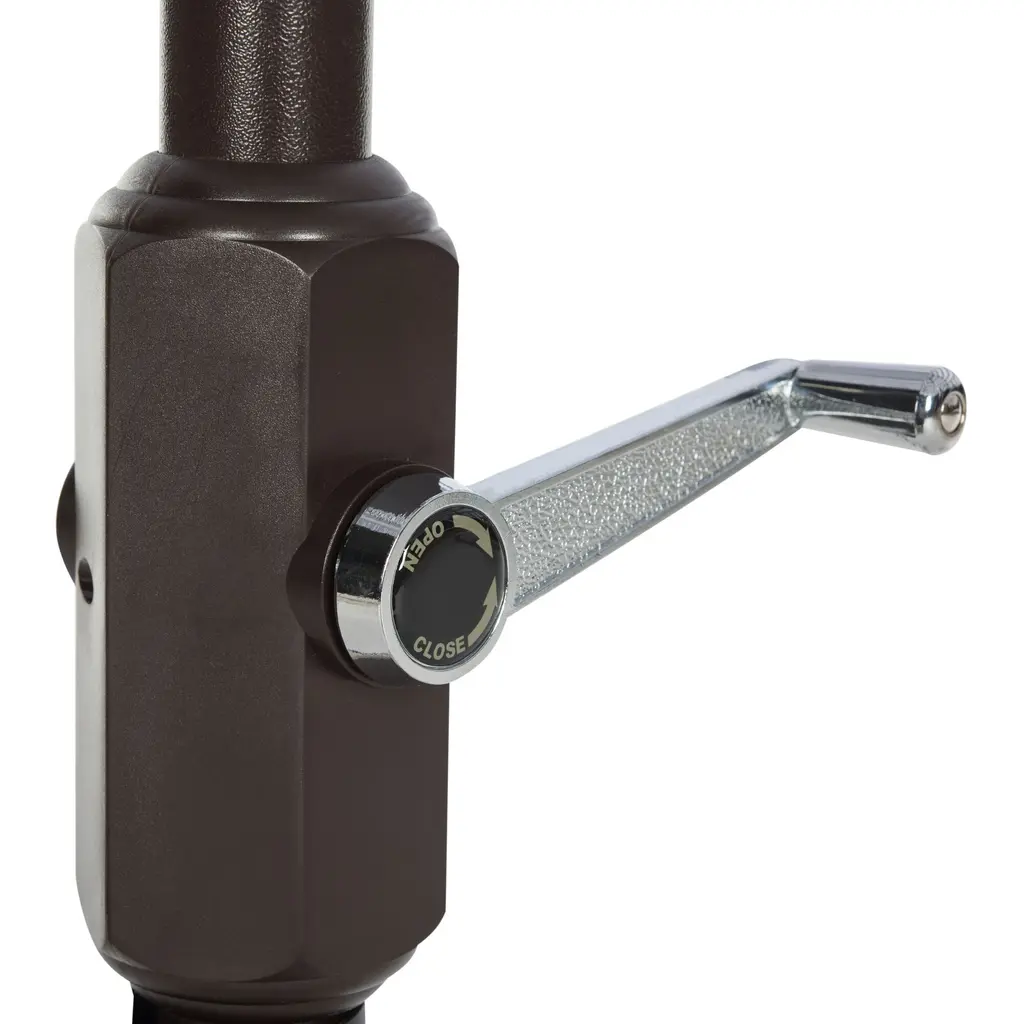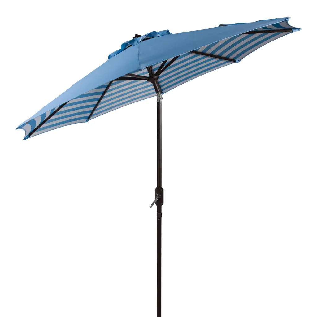 Inspired by the decor of Monaco's finest resorts, this 9-foot tilting patio umbrella features a canopy with white stripes underneath its solid-hued top. Shielding your outdoor setup from harsh U.V. rays., the weather-resistant canopy is available in your choice of colors. The brown crank-lift umbrella frame tilts to a 45-degree angle with the push of a button, providing adjustable sun protection to you backyard or deck at any time of day.