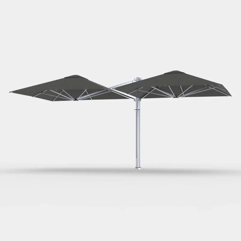 Experience the ultimate in outdoor shade with the Shadowspec Unity™ Square Duo Umbrella. Crafted from durable aluminum and stainless steel, this umbrella stands strong and exudes sophistication. With a nature-inspired design, it opens effortlessly and is perfect for adding an elegant touch to any outdoor setting. Ideal for hospitality or home use. Highlights